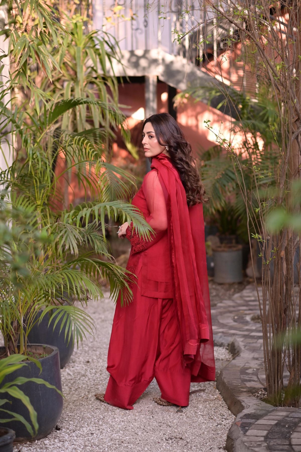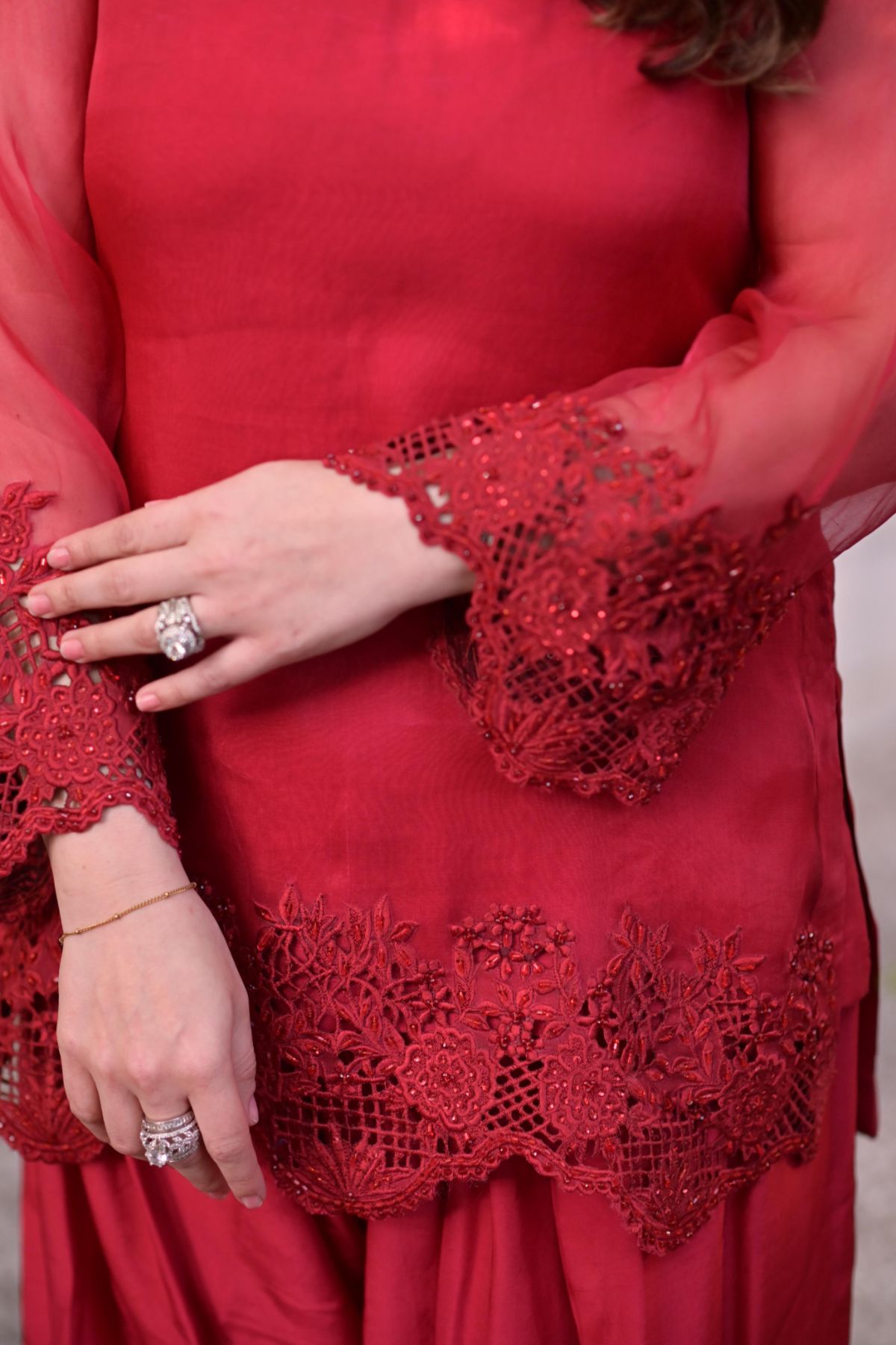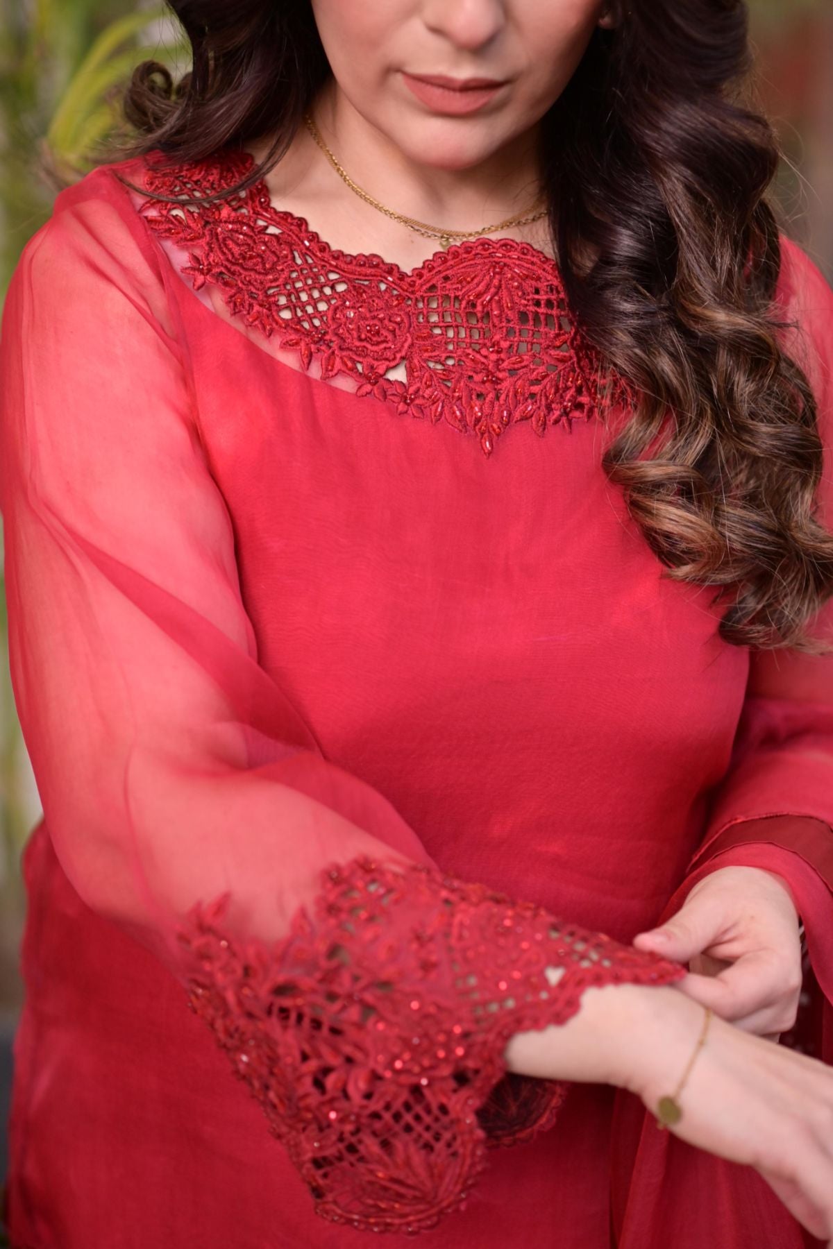 Our deep maroon organza ensemble is a statement of elegance, crafted to embody festive grace. The shirt features exquisite laser-cut embroidery and intricate cutwork, enriched with delicate hand embellishments that highlight a luxurious appeal. Detailed artistry on the neckline, sleeves, and borders creates a perfect harmony of traditional craftsmanship and modern finesse. A flowing organza dupatta with refined finishing enhances the ensemble, while the rich silk farshi shalwar completes the look. Sophisticated and timeless, this 3-piece outfit is the perfect choice for Eid celebrations and festive occasions.