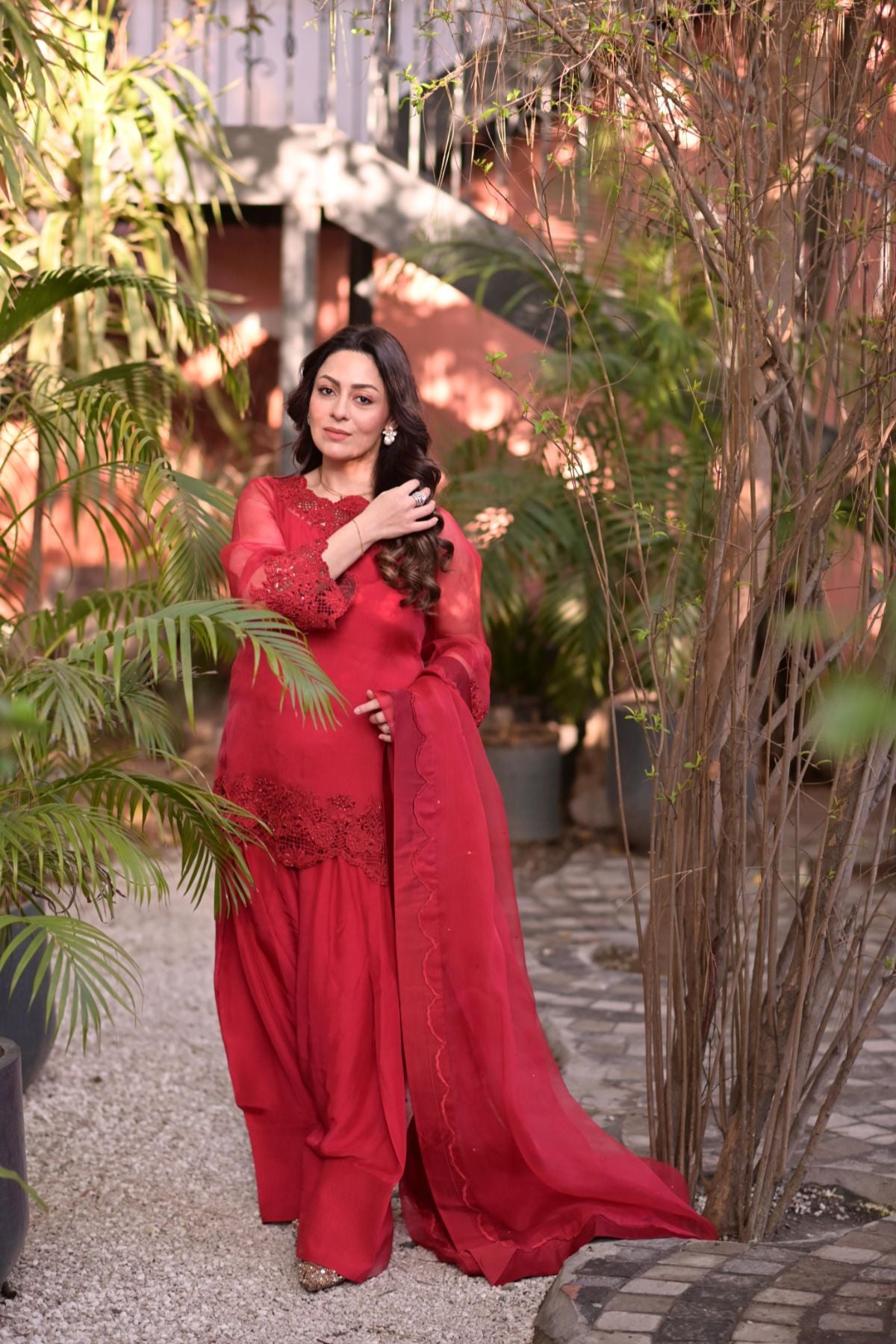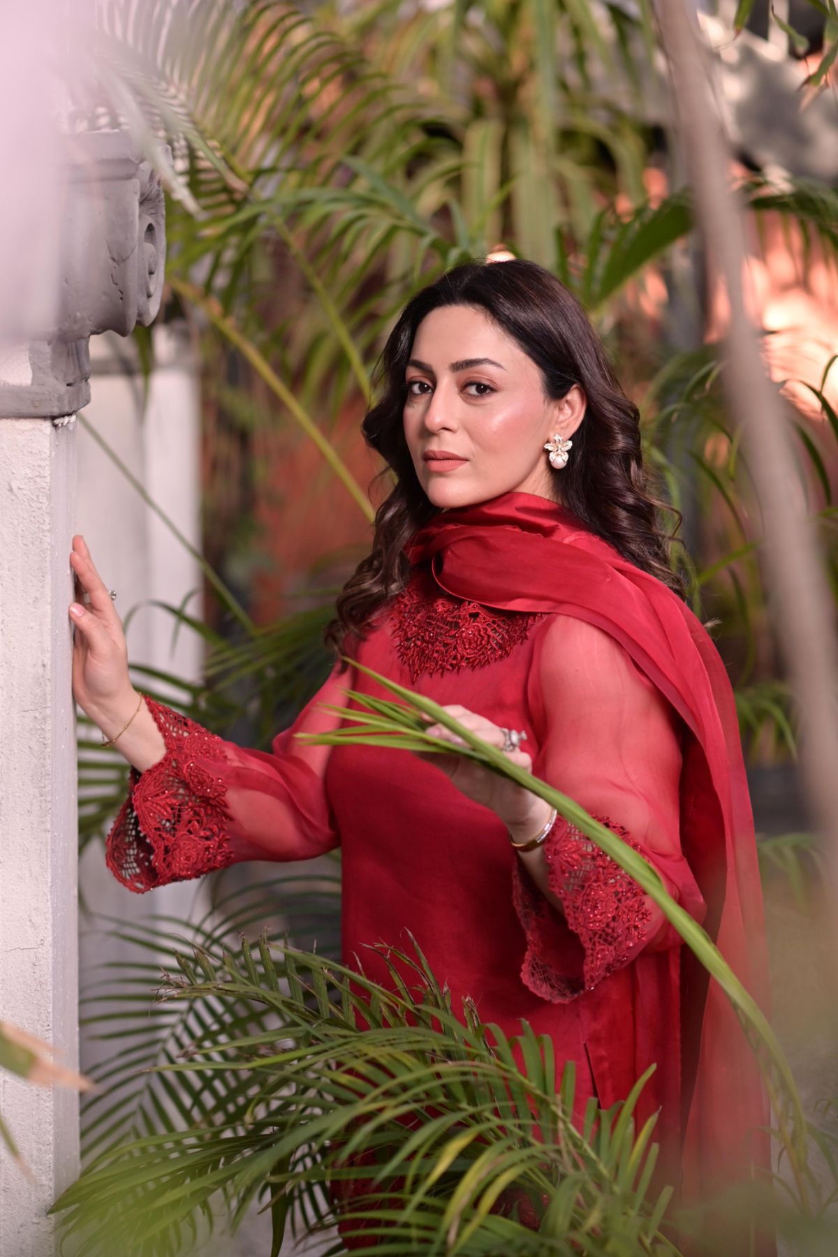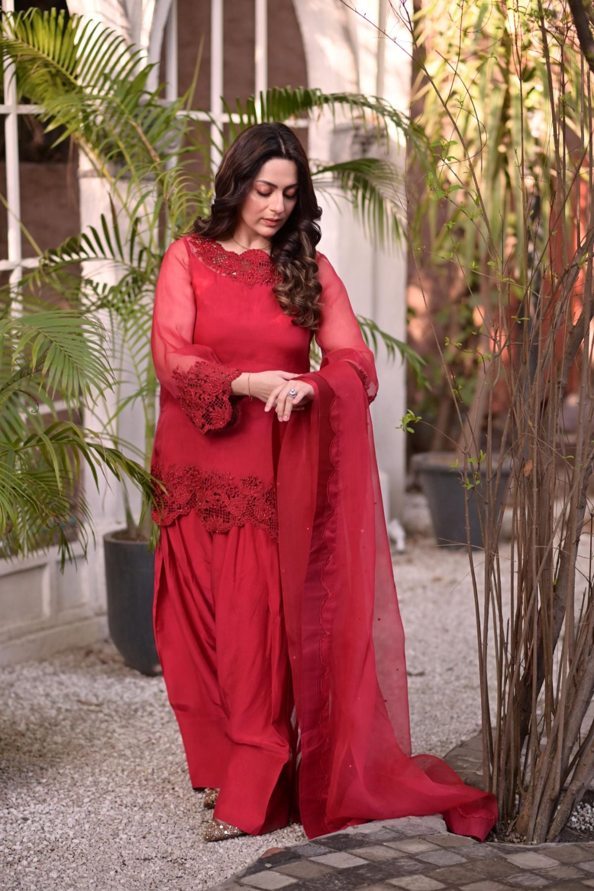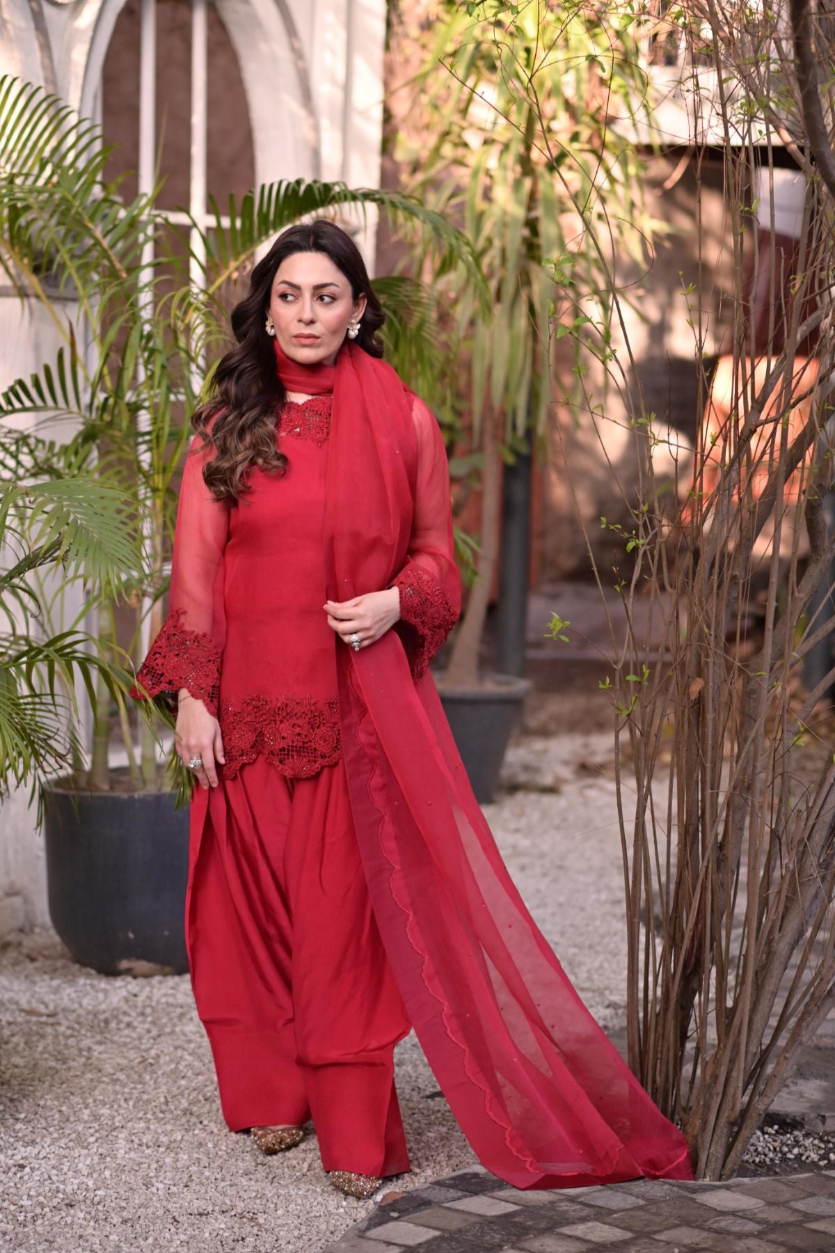 Our deep maroon organza ensemble is a statement of elegance, crafted to embody festive grace. The shirt features exquisite laser-cut embroidery and intricate cutwork, enriched with delicate hand embellishments that highlight a luxurious appeal. Detailed artistry on the neckline, sleeves, and borders creates a perfect harmony of traditional craftsmanship and modern finesse. A flowing organza dupatta with refined finishing enhances the ensemble, while the rich silk farshi shalwar completes the look. Sophisticated and timeless, this 3-piece outfit is the perfect choice for Eid celebrations and festive occasions.