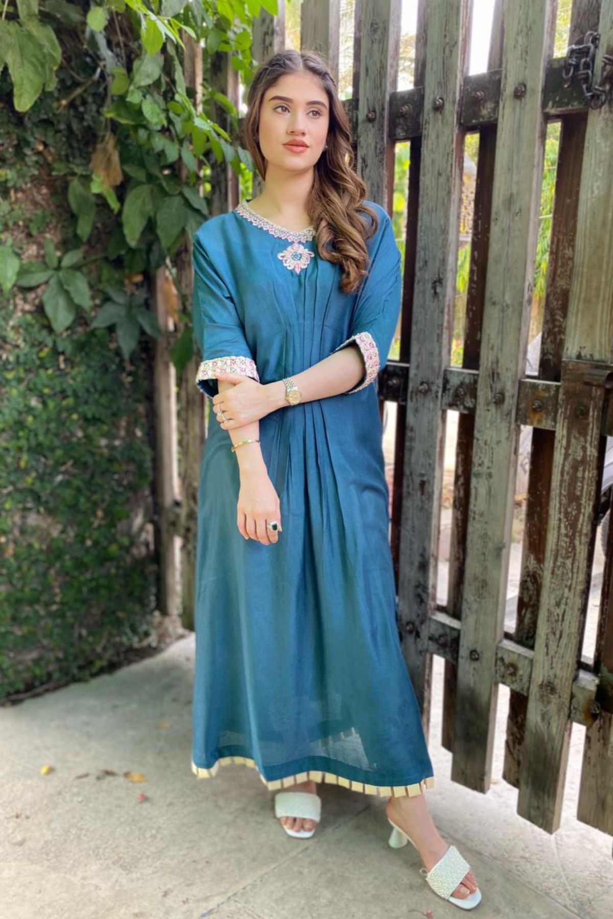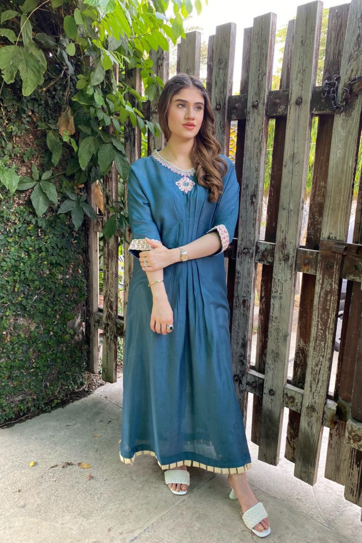 Our premium cotton net kaftan features a stylish cutline with intricate neck and cuff embroidery, finished with delicate hand embellishments. This piece combines comfort with elegant craftsmanship for a sophisticated look.