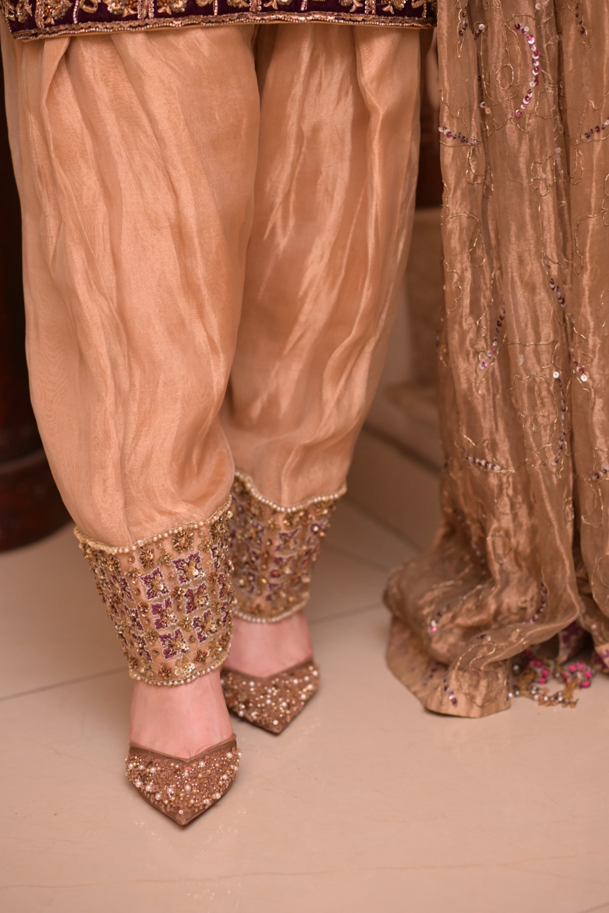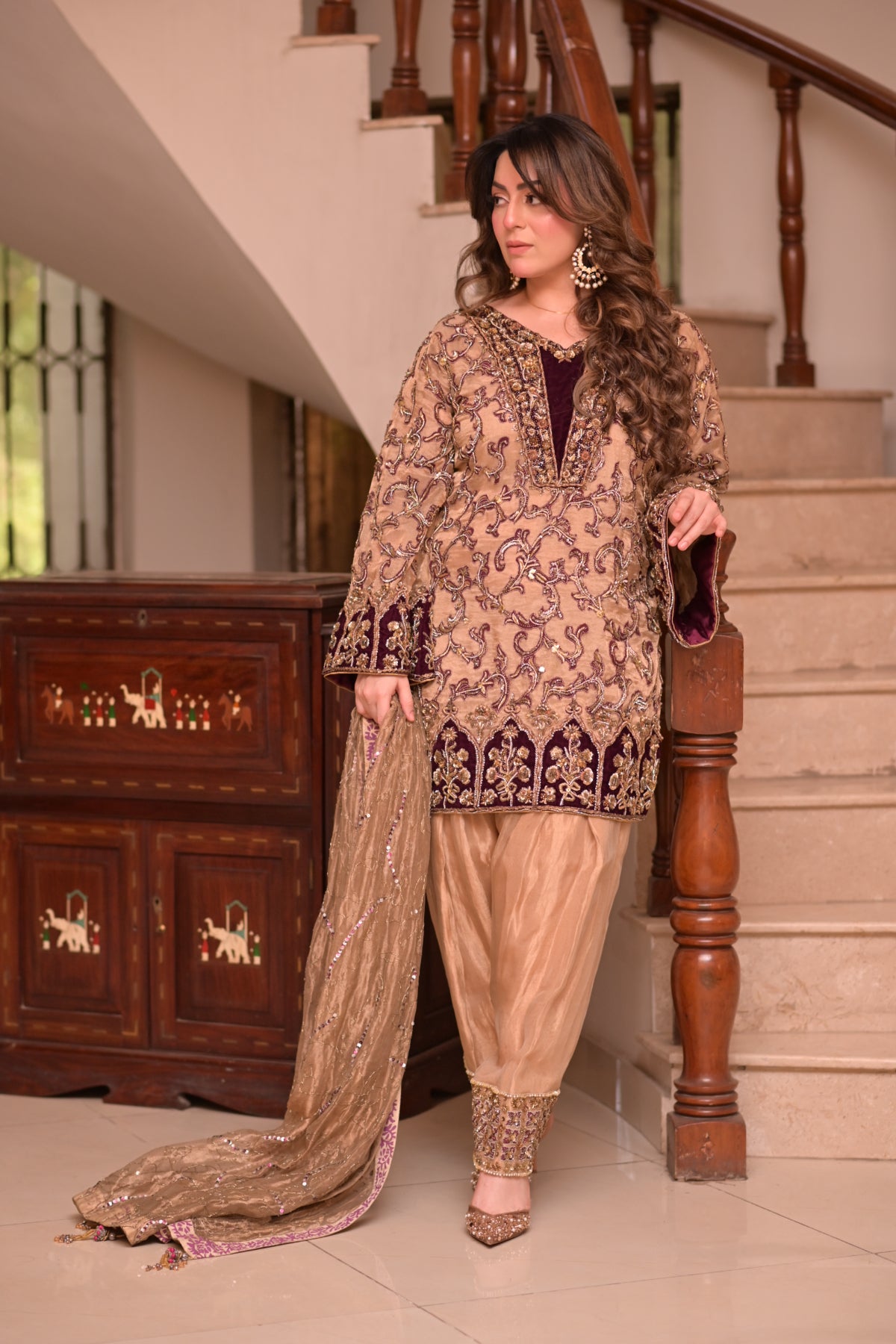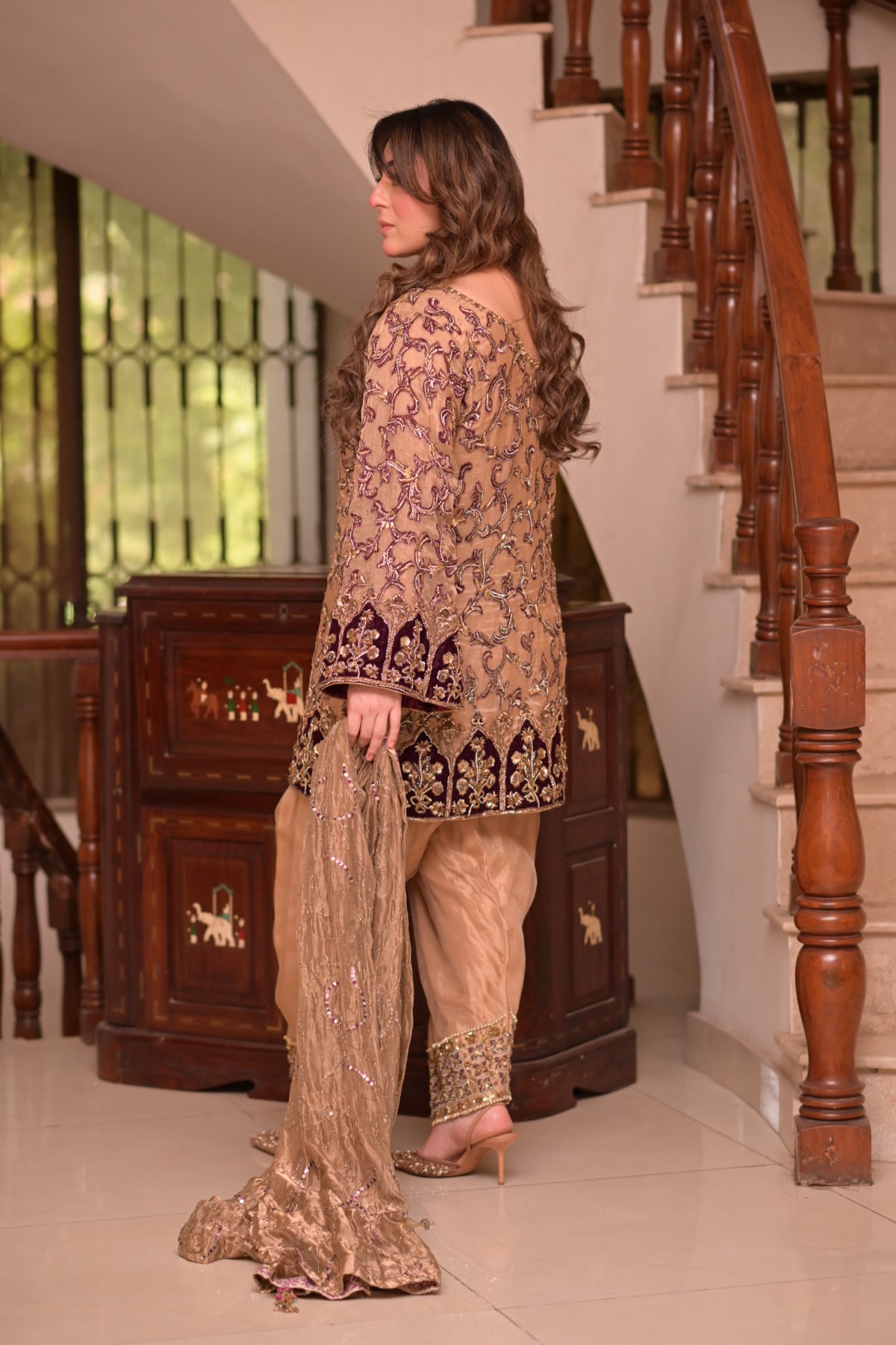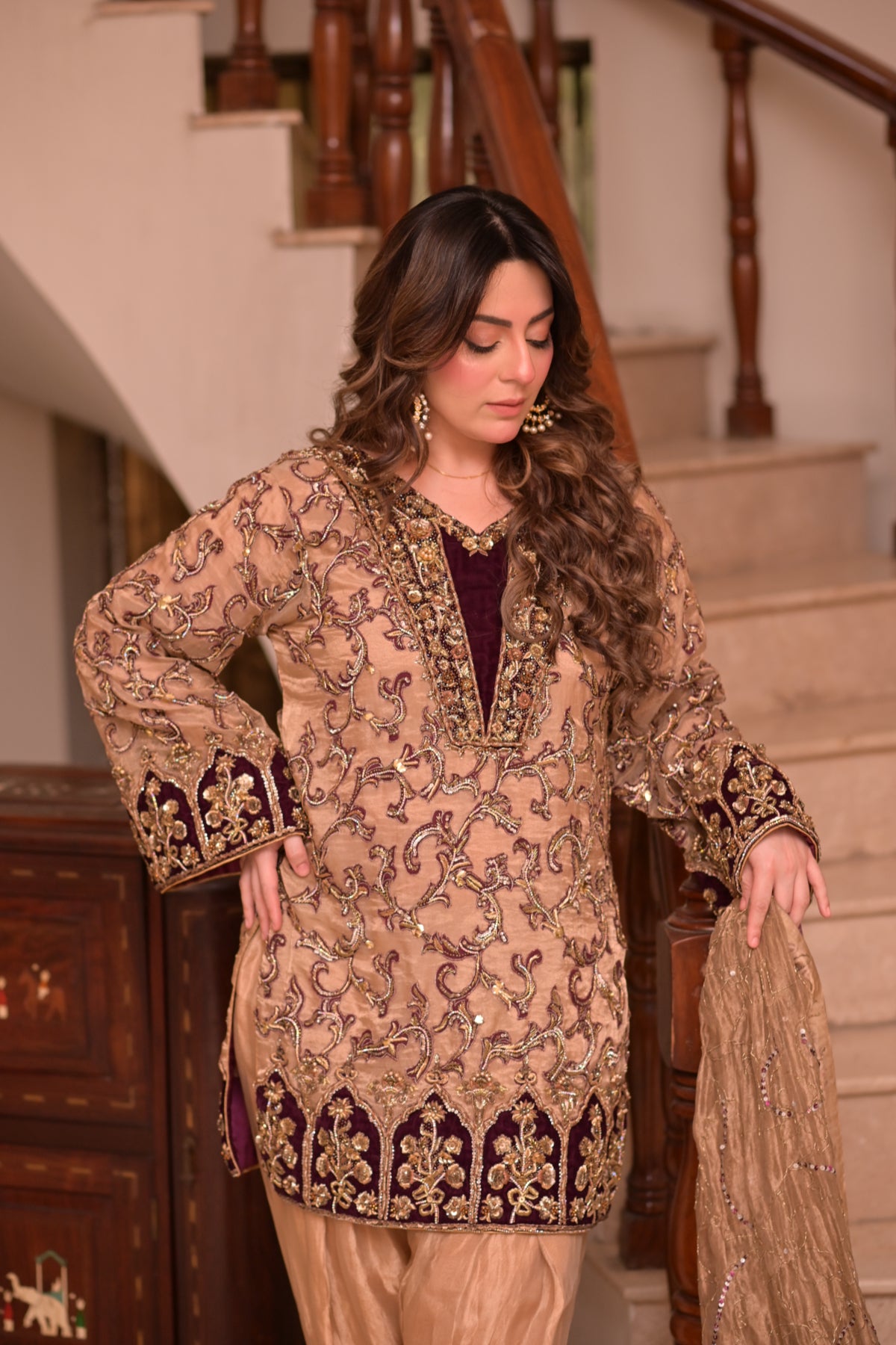 An exquisite formal wear ensemble crafted from luxurious tissue fabric, designed for timeless sophistication. This set features a beautifully detailed shirt with rich, heavy handwork spanning the front and back, showcasing masterful artistry. The matching tissue shalwar adds a graceful touch with its delicately embellished cuffs, while the complementary dupatta features an all-over jaal pattern for a regal finish.