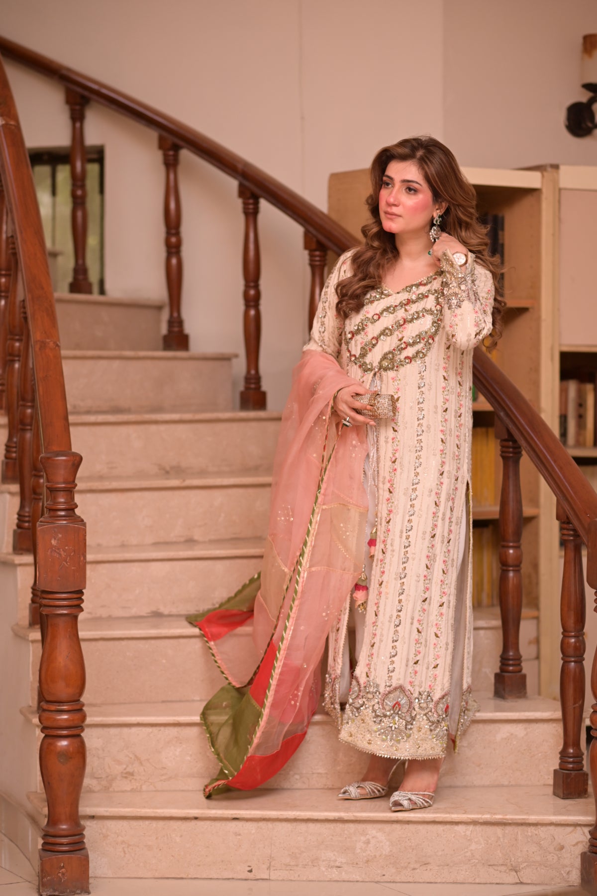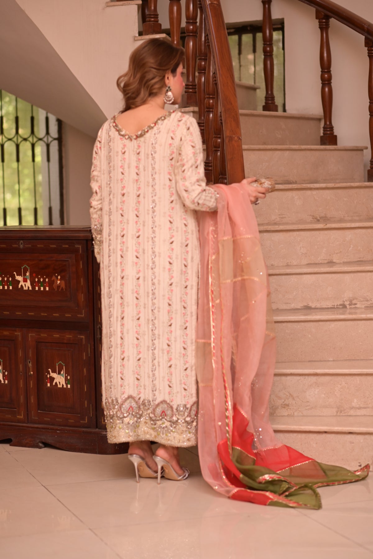 The sleek churidar silk trouser complements the ensemble with refined elegance, while the airy organza dupatta, styled with soft hues and subtle detailing, completes the look with sophistication. Perfect for formal gatherings, this outfit beautifully merges traditional artistry with modern finesse.