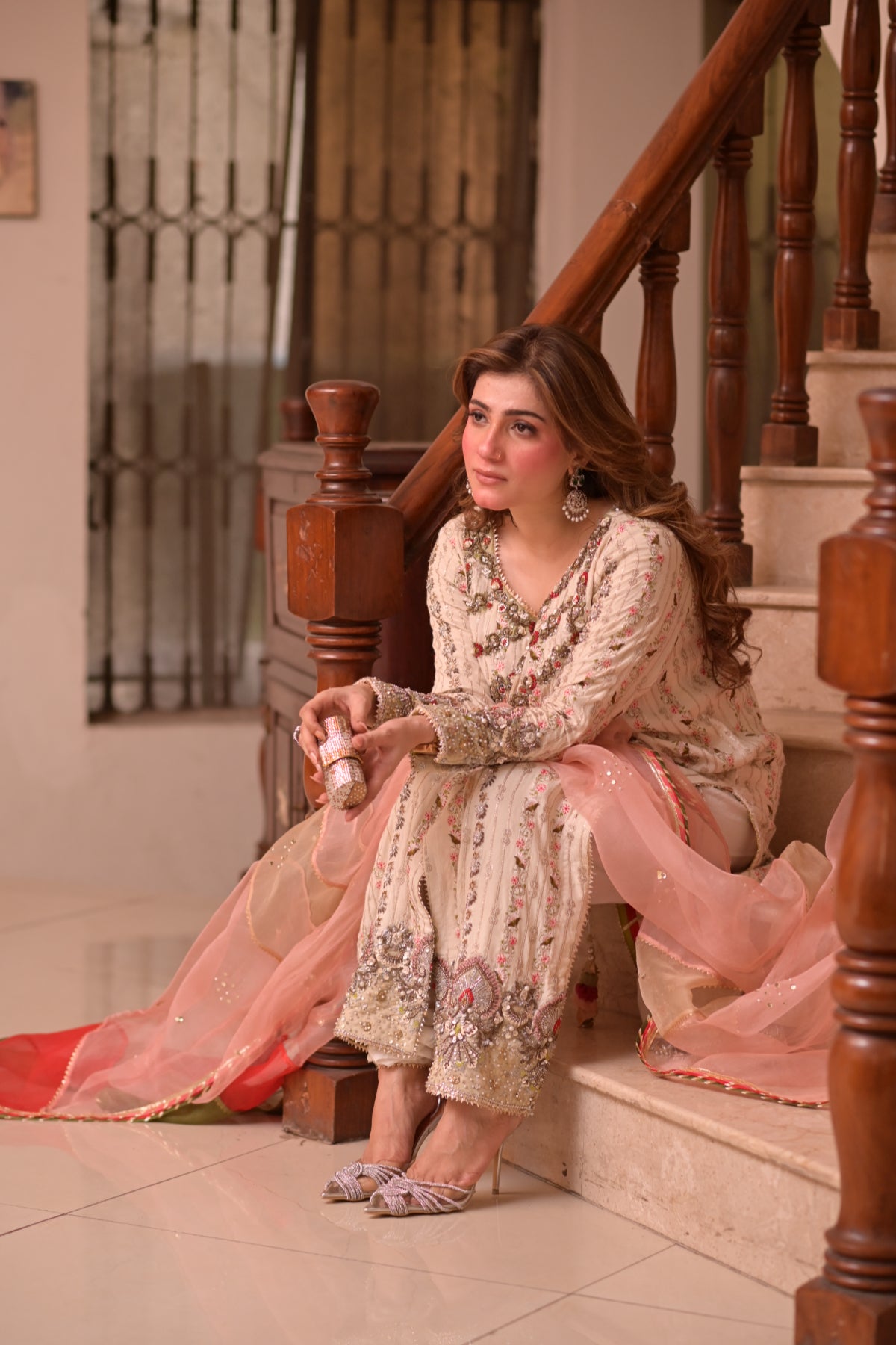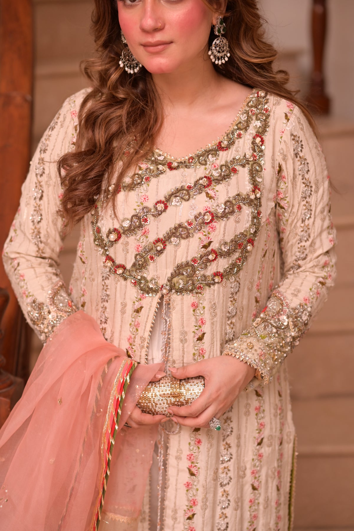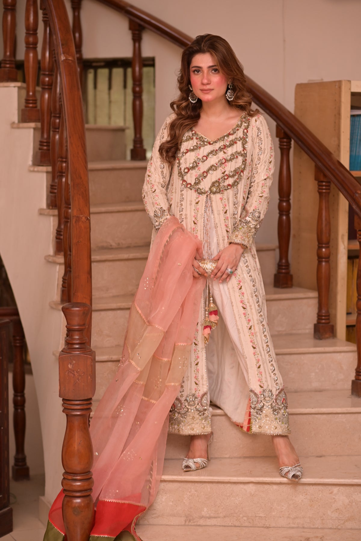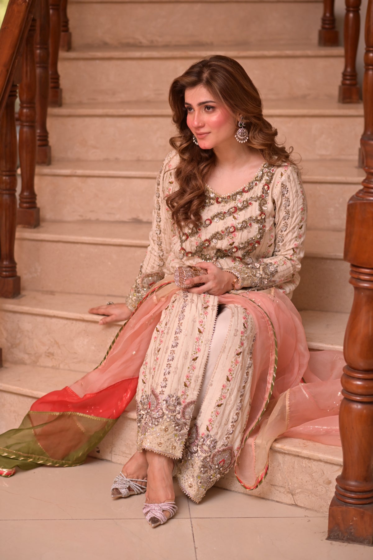 A graceful formal design crafted on fine silk, this outfit radiates timeless charm with intricate craftsmanship. The shirt is adorned with heavy hand-embellished details across the front, back, sleeves, and borders, featuring delicate embroidery, sequins, and beadwork that exude a regal allure.