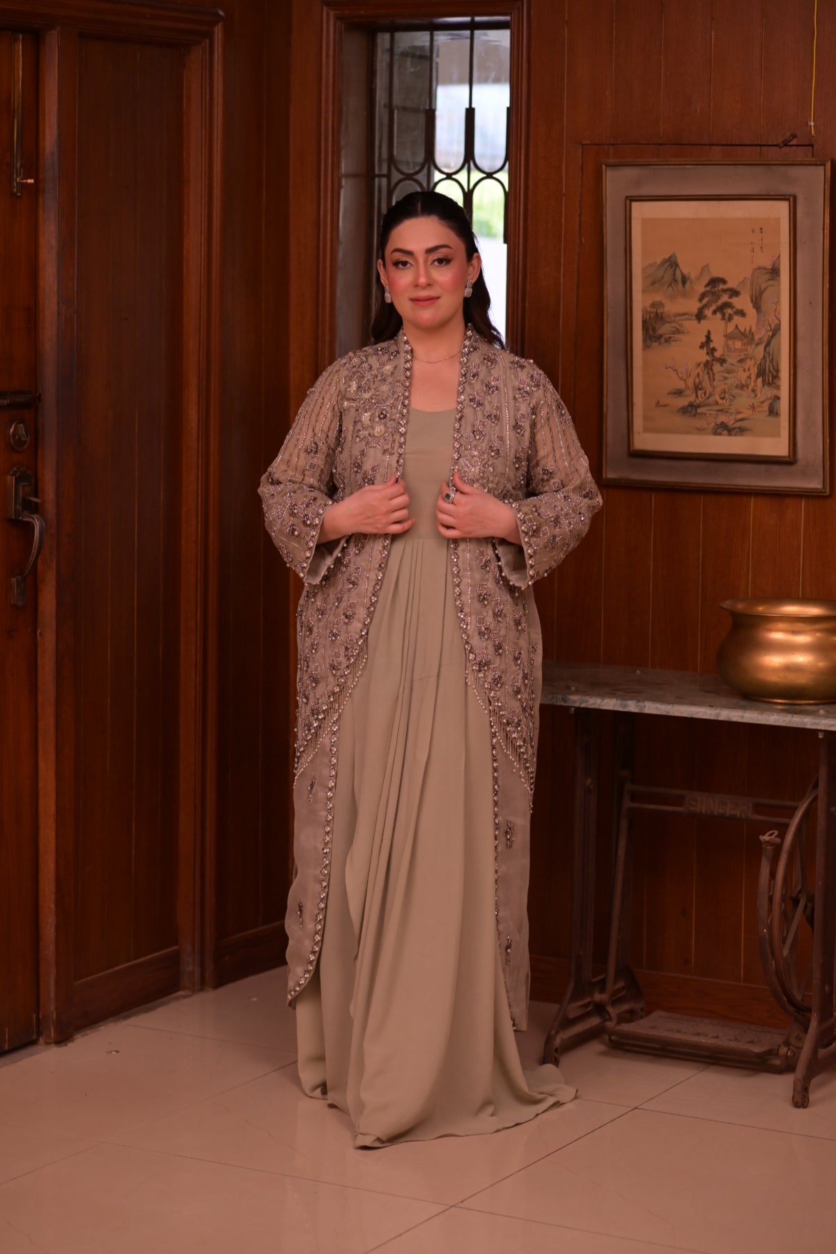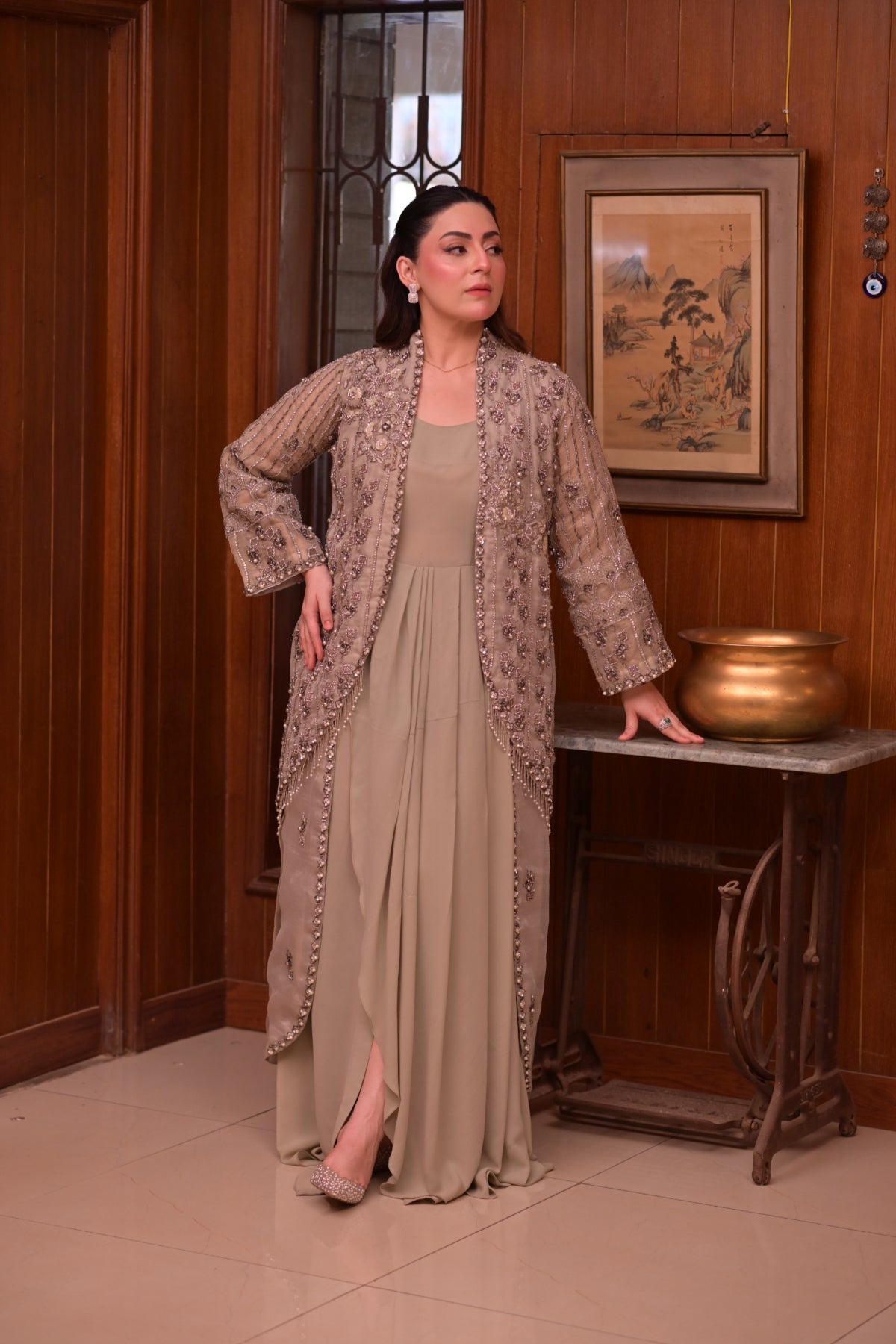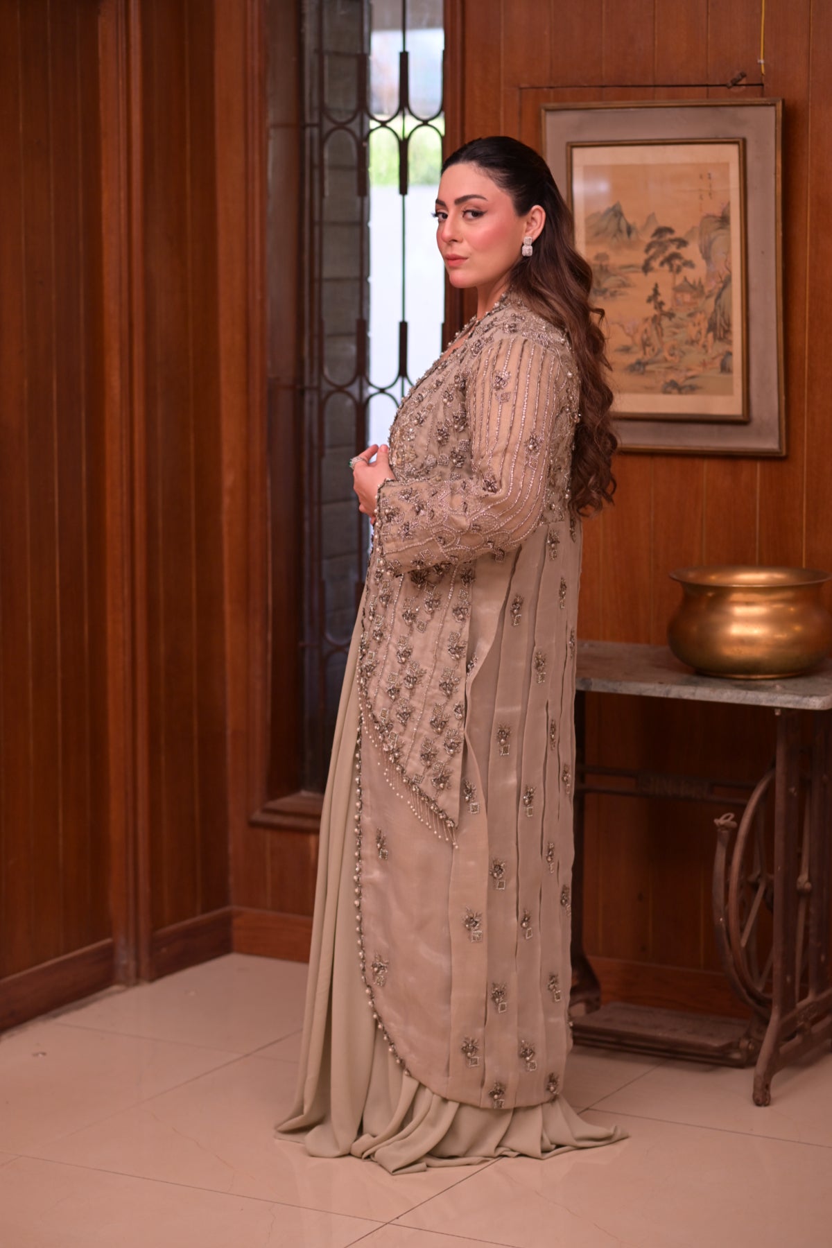 The subtle mint tone adds a refreshing charm, making it a refined choice for formal occasions. With its elegant cut and intricate handwork, this outfit perfectly blends modern refinement with traditional artistry.