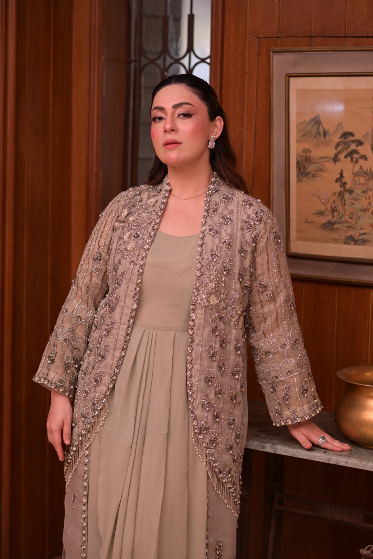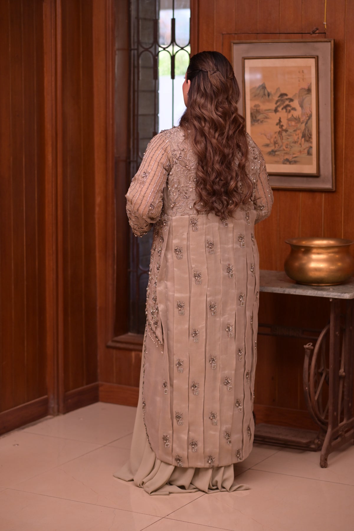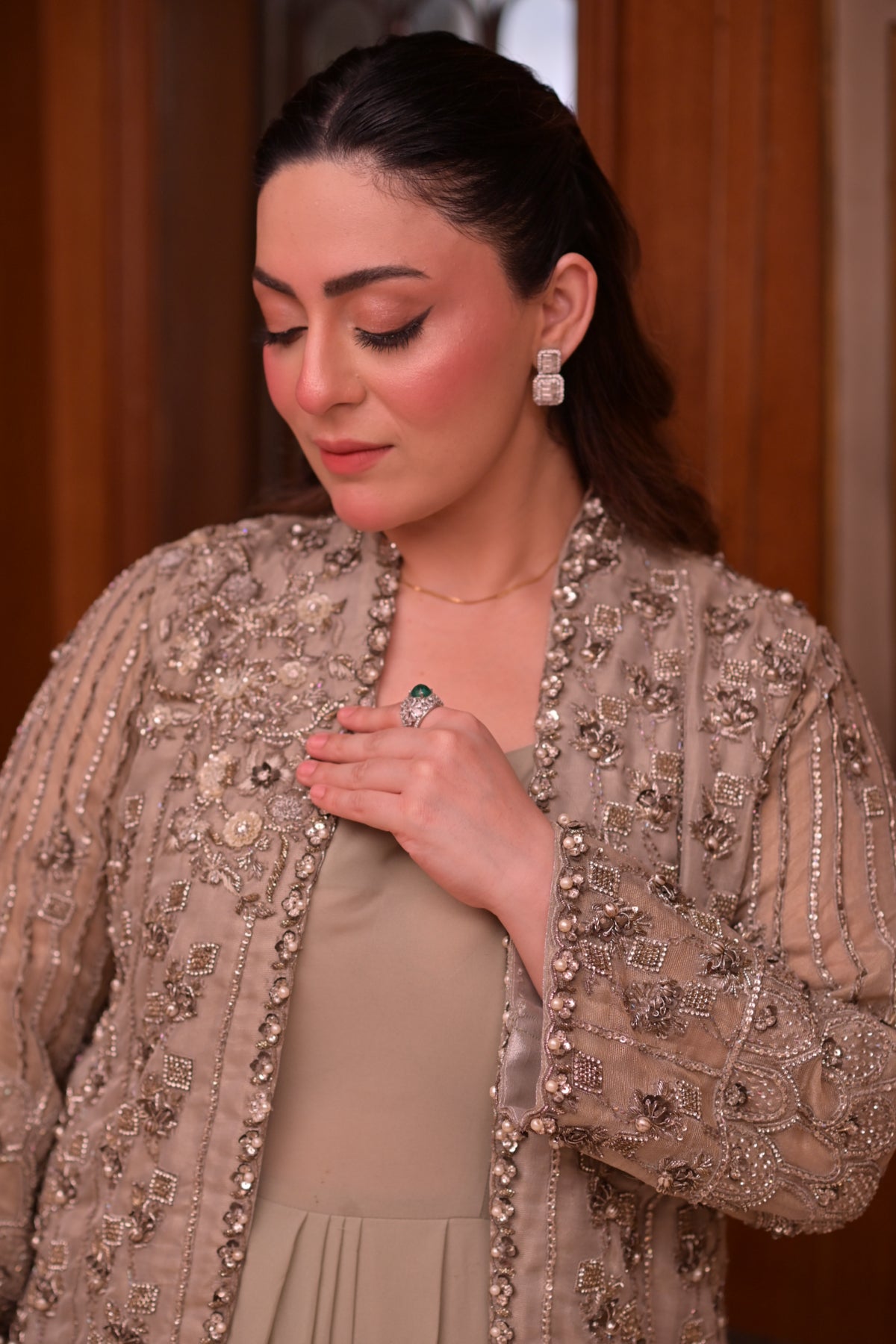 The subtle mint tone adds a refreshing charm, making it a refined choice for formal occasions. With its elegant cut and intricate handwork, this outfit perfectly blends modern refinement with traditional artistry.