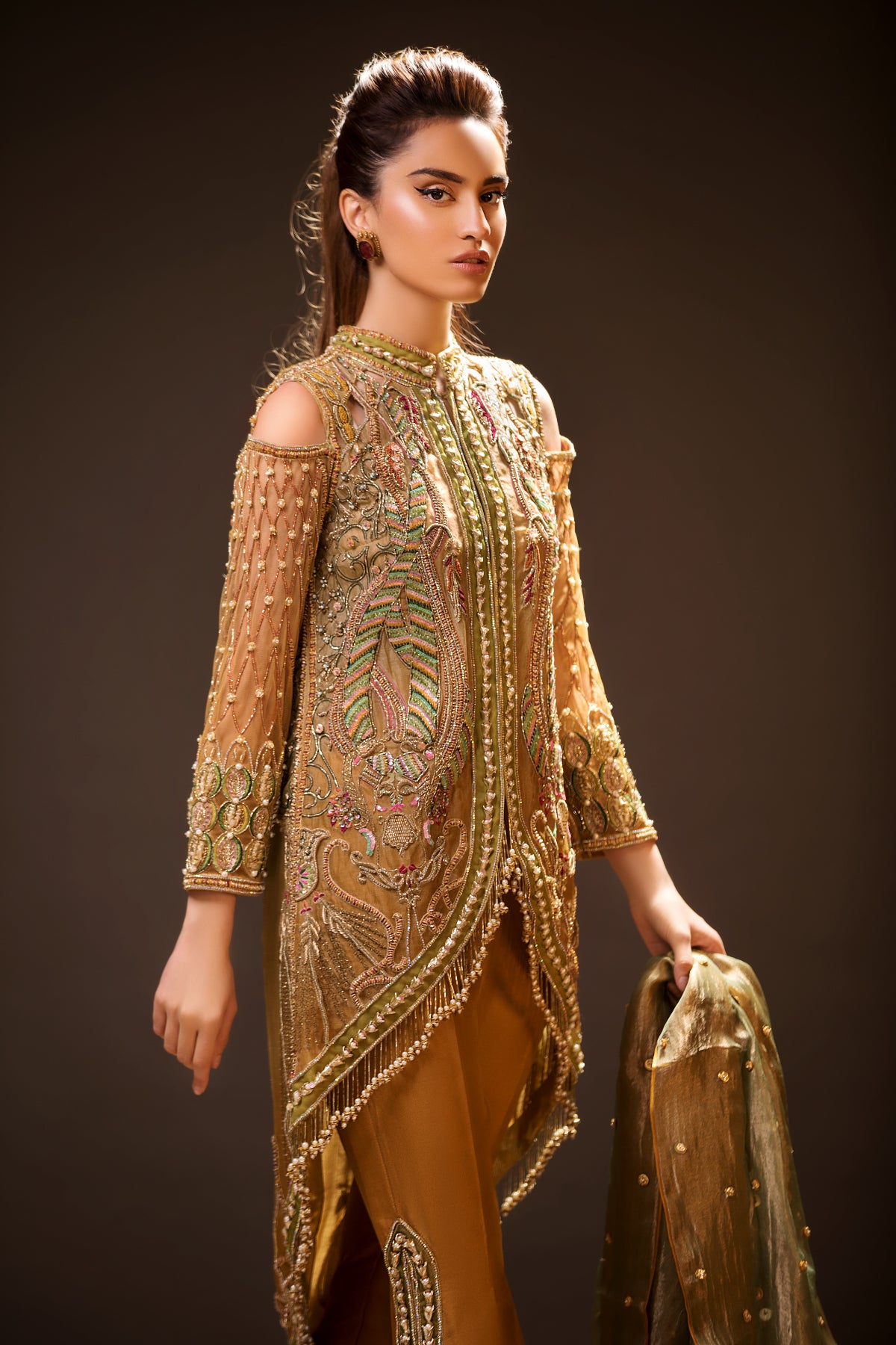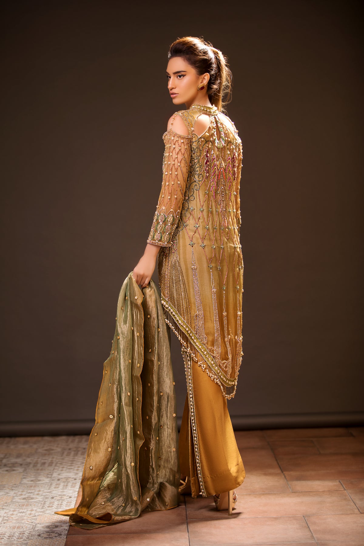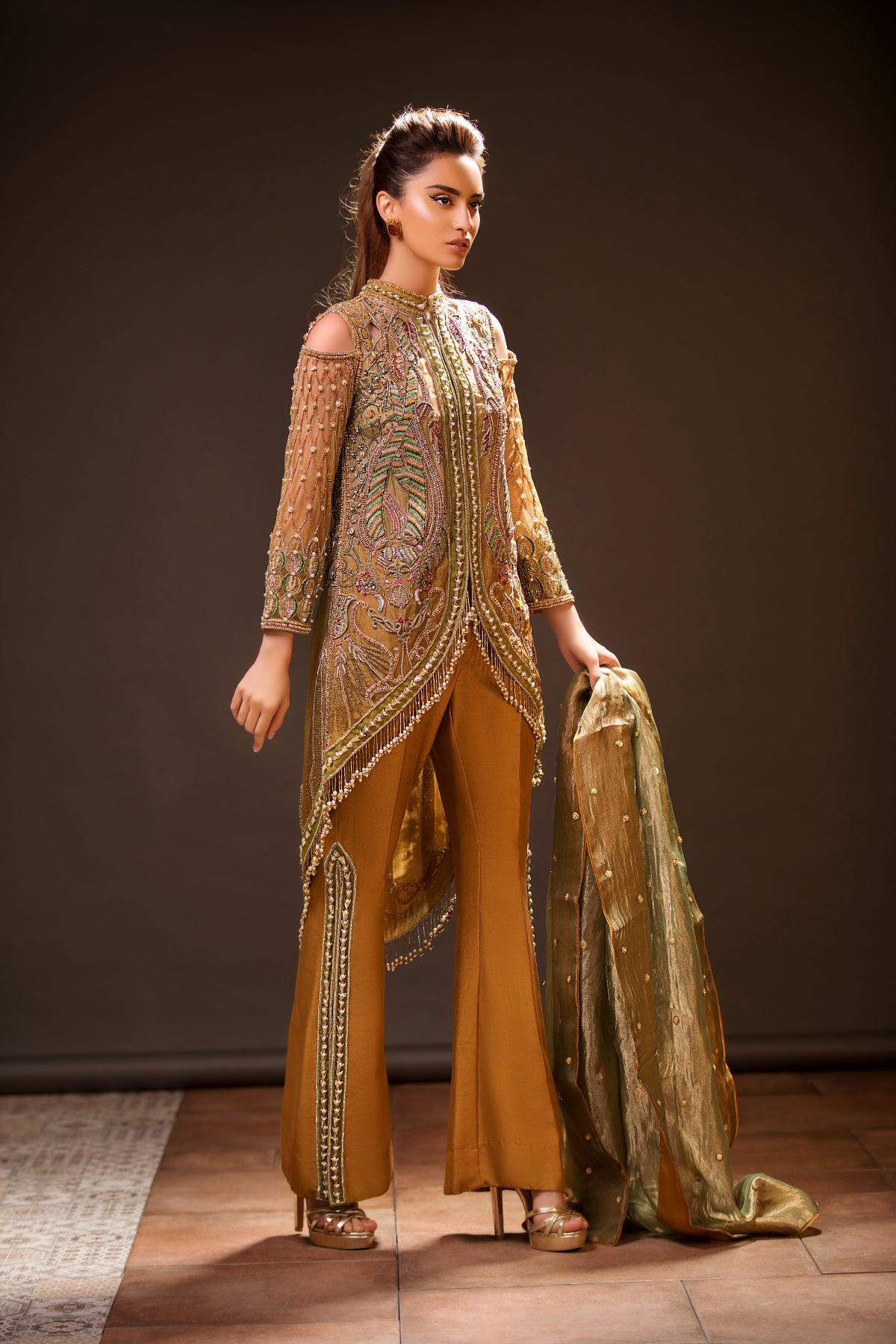 Paired with flared mustard trousers and a contrasting olive green dupatta with scattered motifs and a refined border, this outfit blends tradition with elegance. A statement piece perfect for festive events, receptions, and formal gatherings.