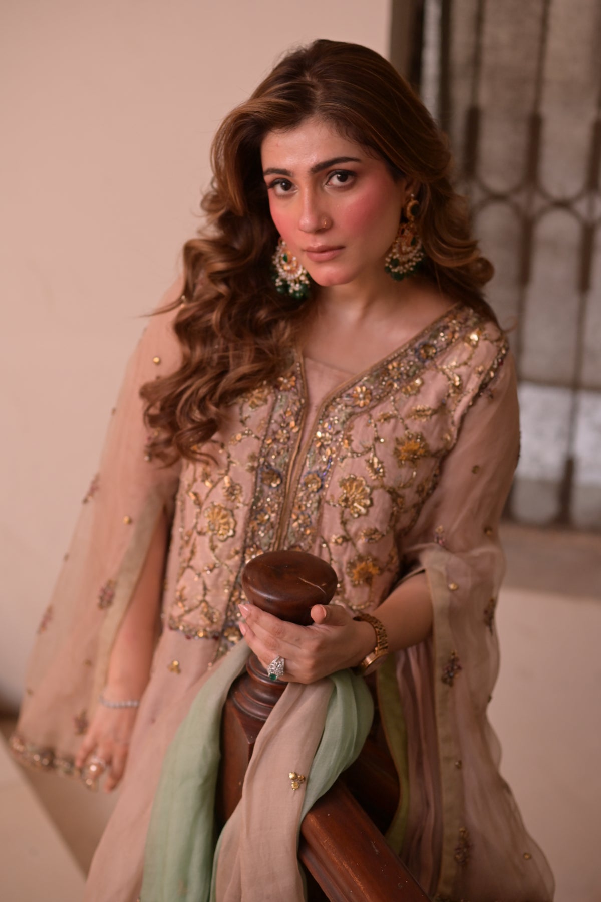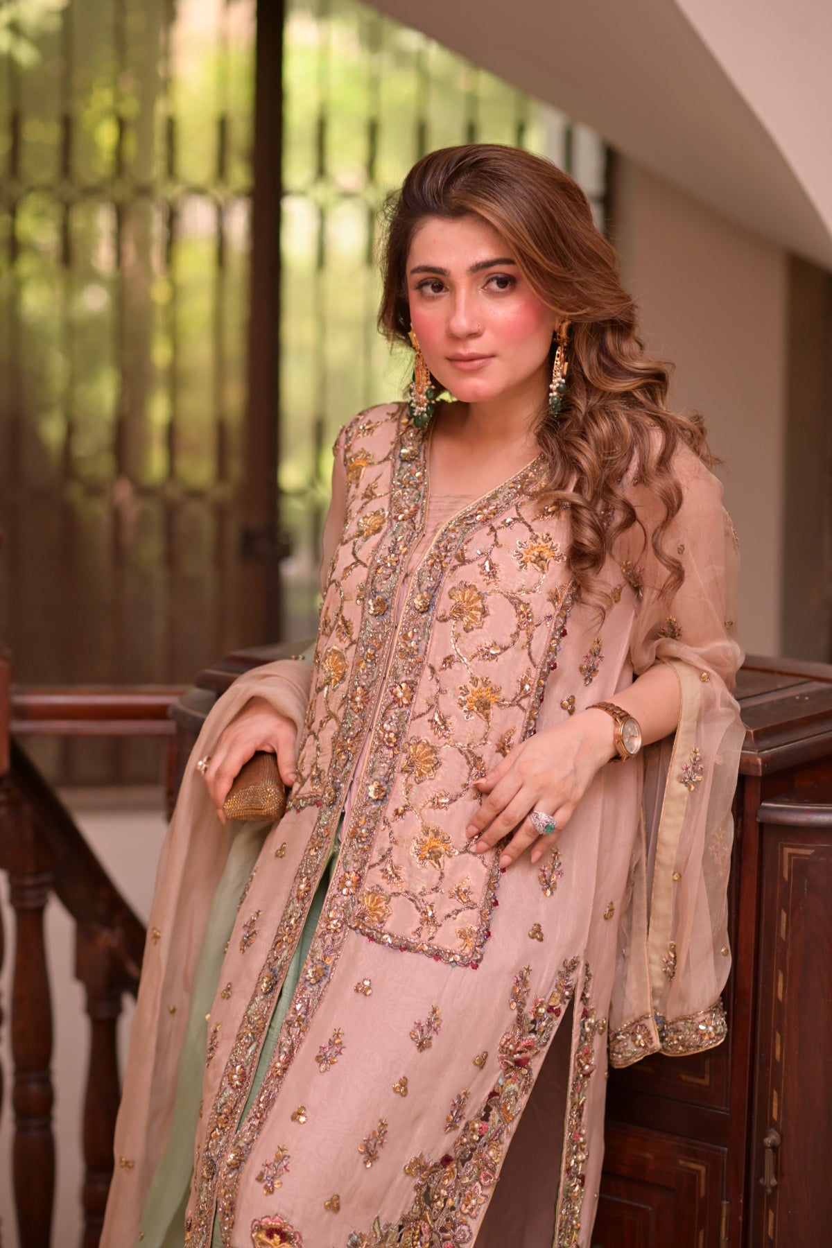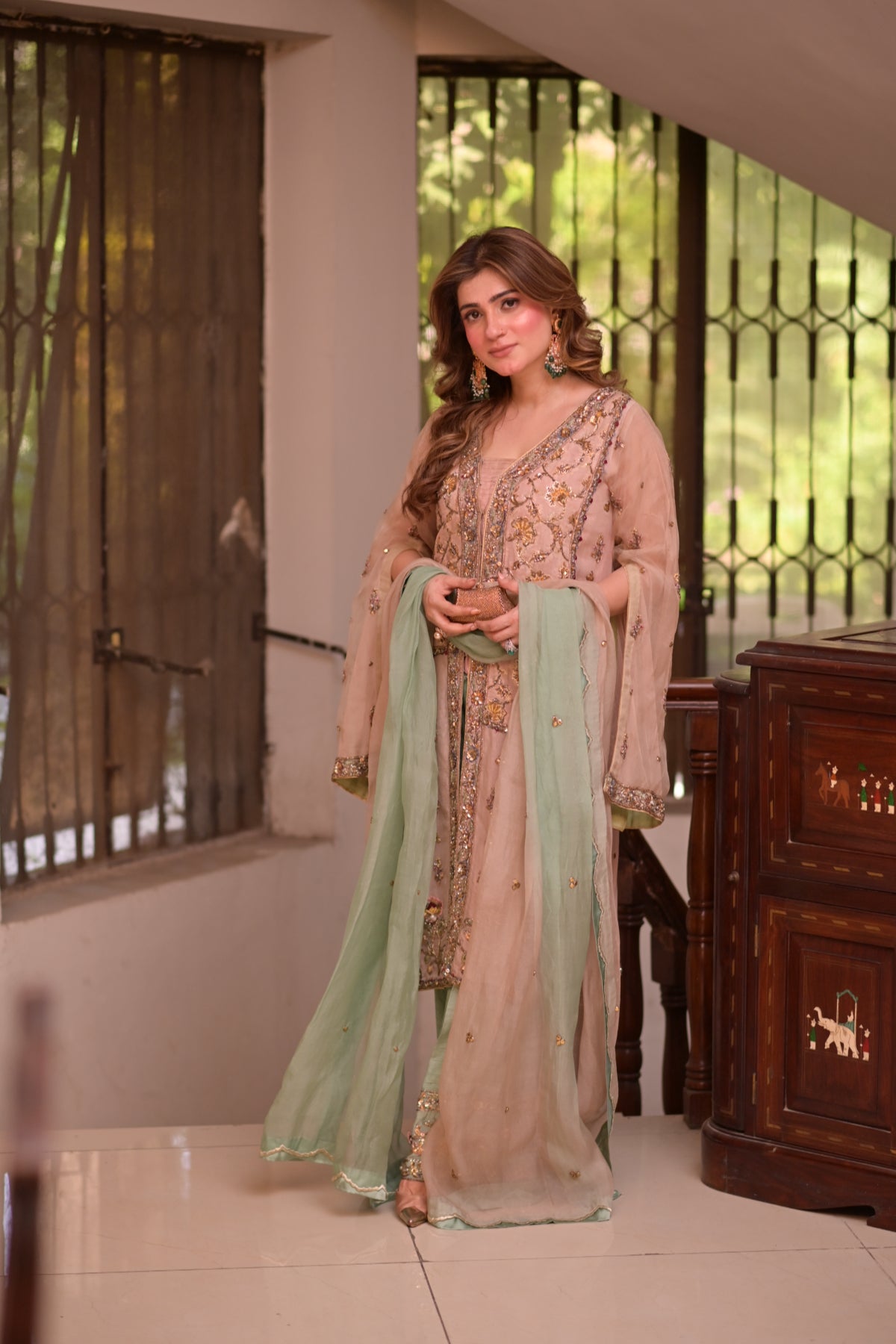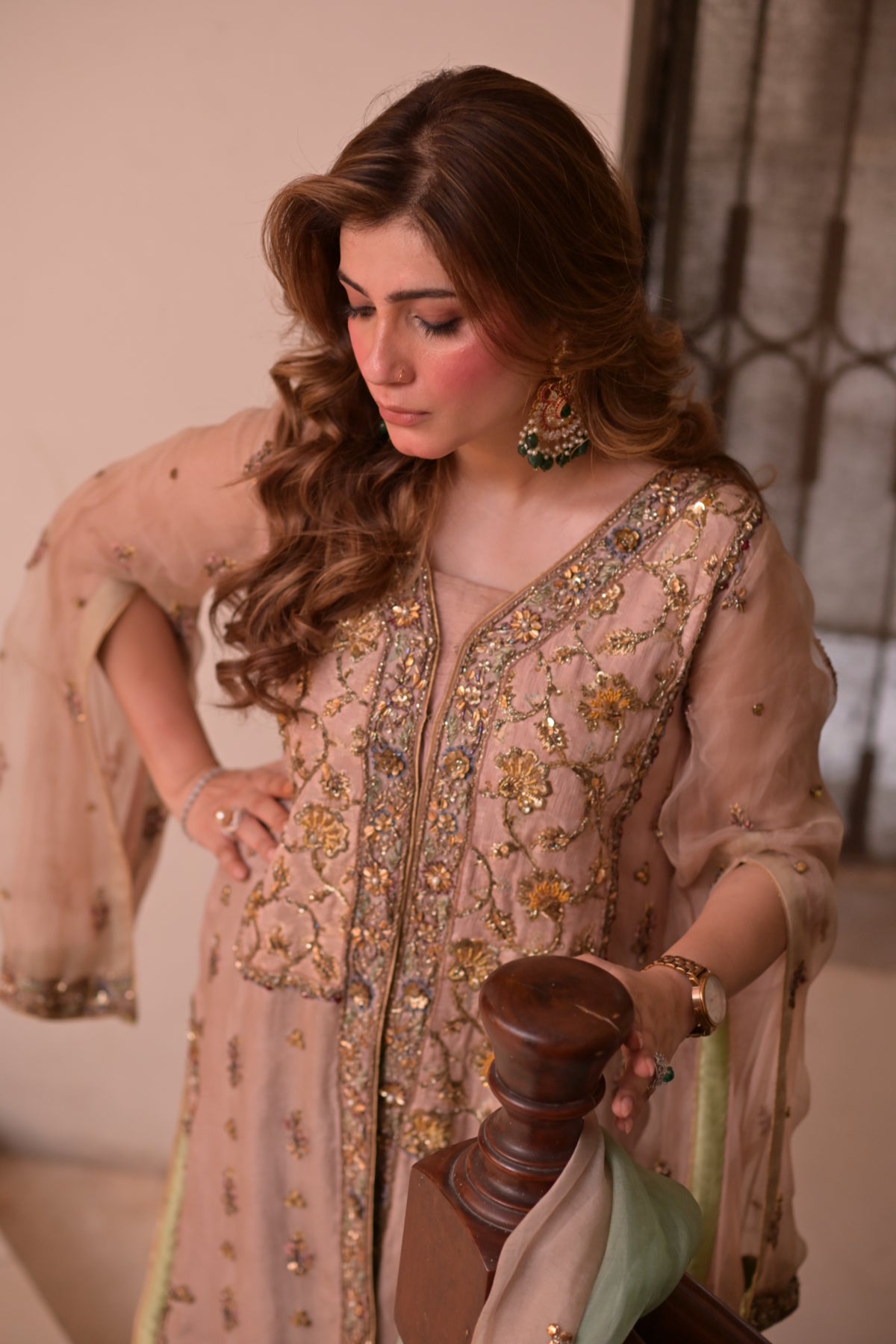 The two-toned organza dupatta is finished with elegant scalloped edges and light spray work, enhancing the ensemble with a sophisticated charm. Perfect for formal gatherings, this design captures both luxury and subtlety in equal measure.