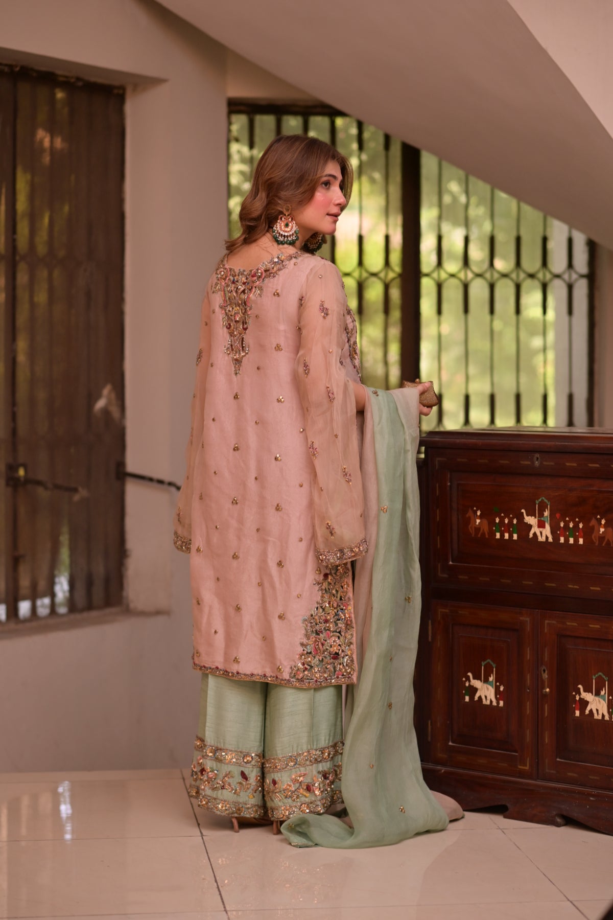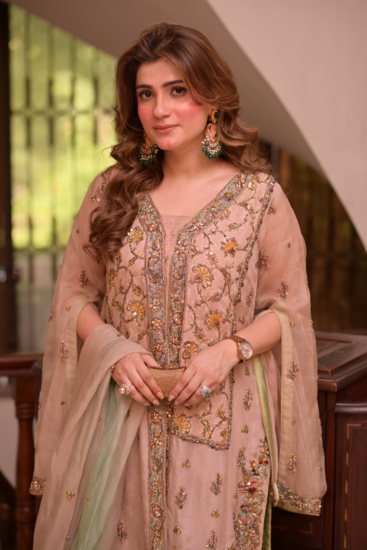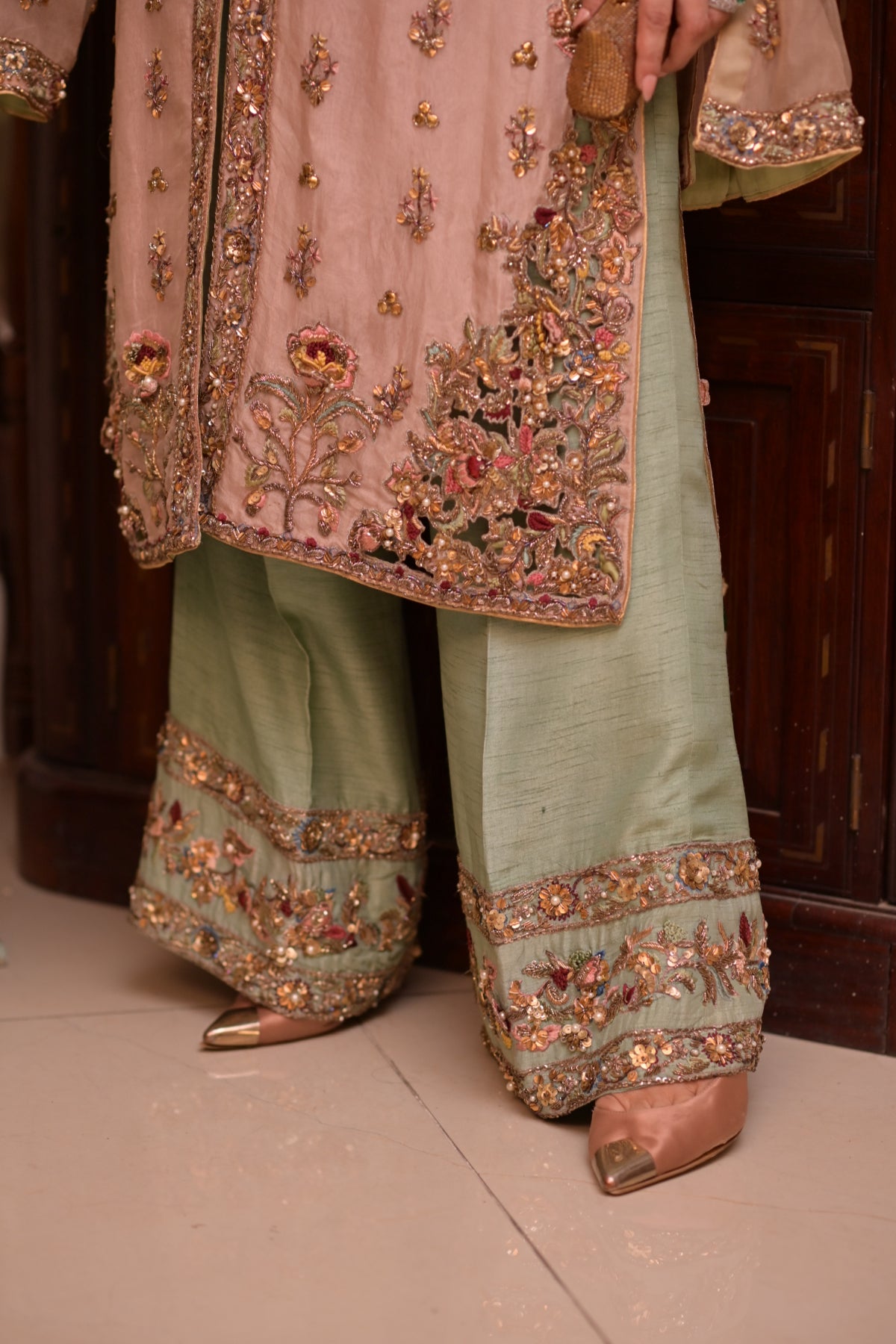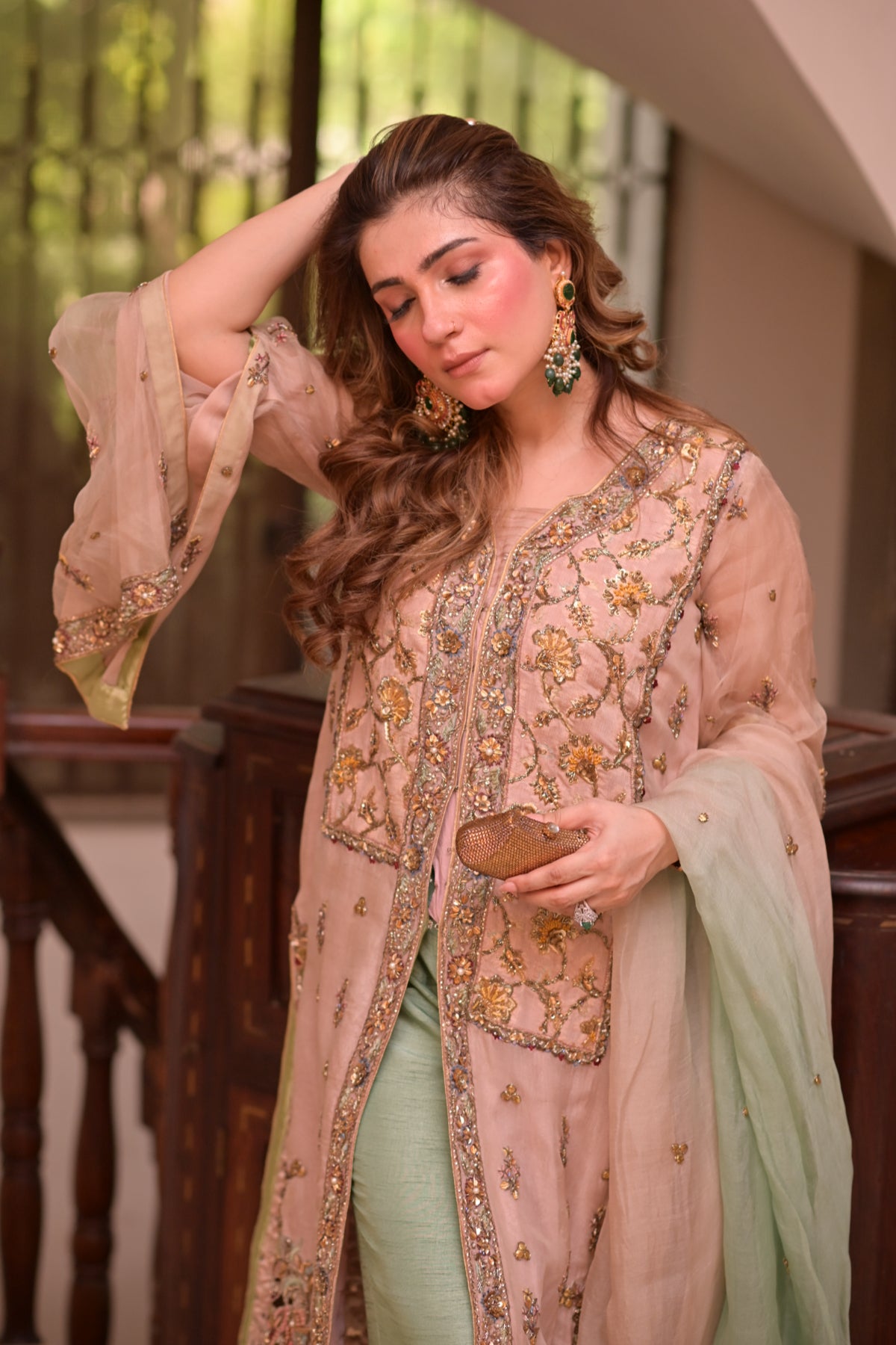 A refined formal wear design that blends soft tones with exquisite craftsmanship. The organza shirt is adorned with heavy handwork across the front, sleeves, and borders, creating a timelessly graceful look. Paired with a raw silk trouser featuring delicate embellishments, it adds depth and richness to the overall silhouette.