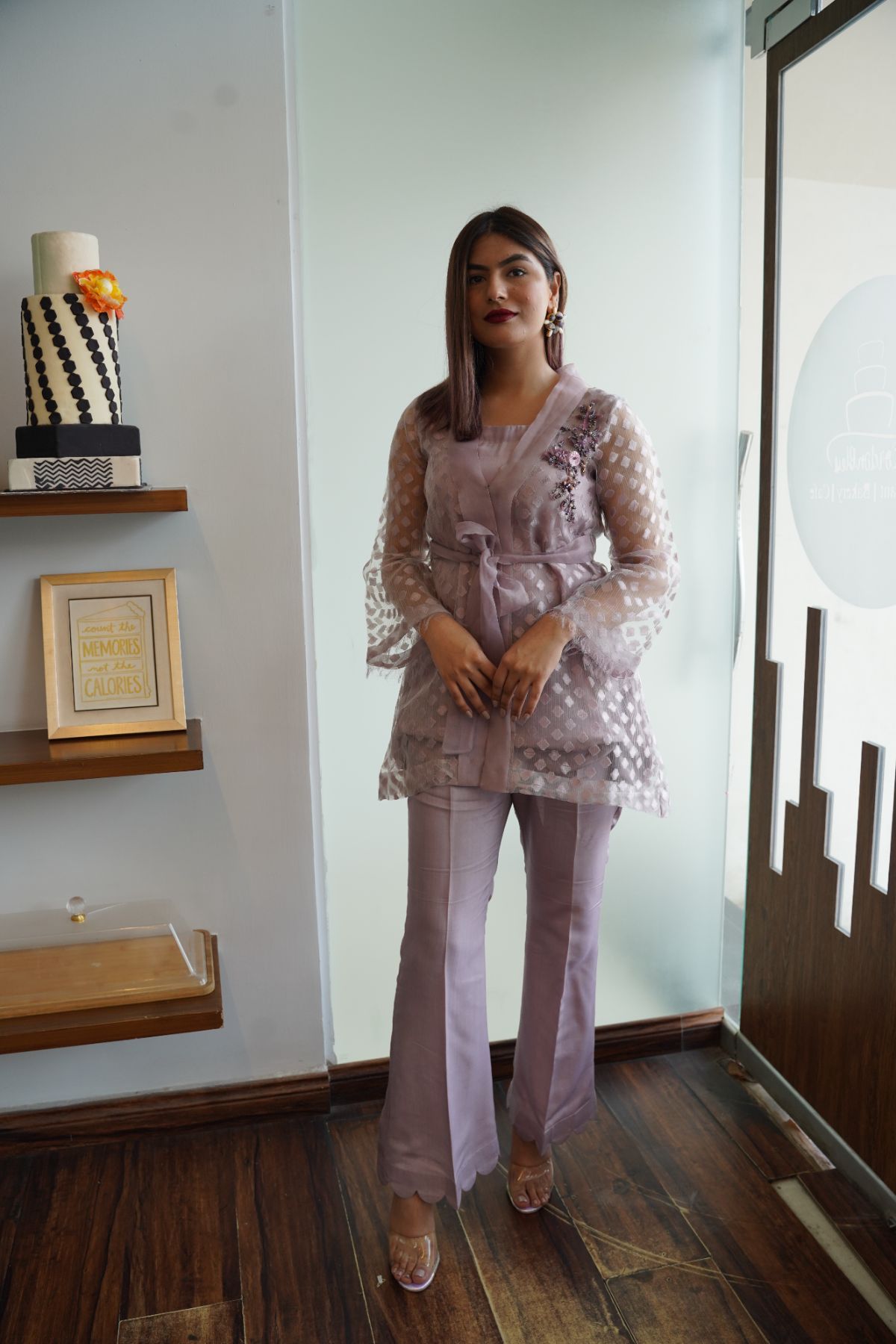 This refined ensemble features an embossed organza wrap, enhanced with rough-edged organza borders on the sleeves and a delicately hand-worked motif on the front. Paired with a matching trouser, the design balances simplicity with artisanal detail, making it a graceful choice for formal occasions.