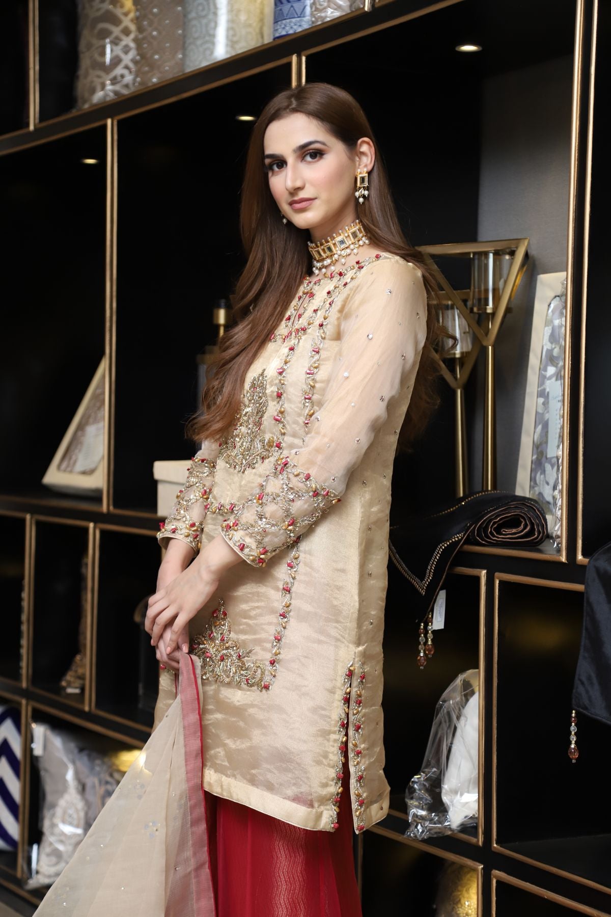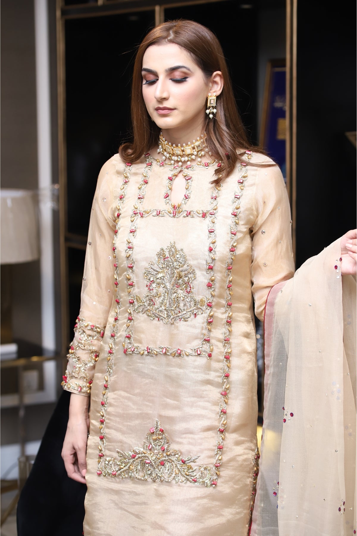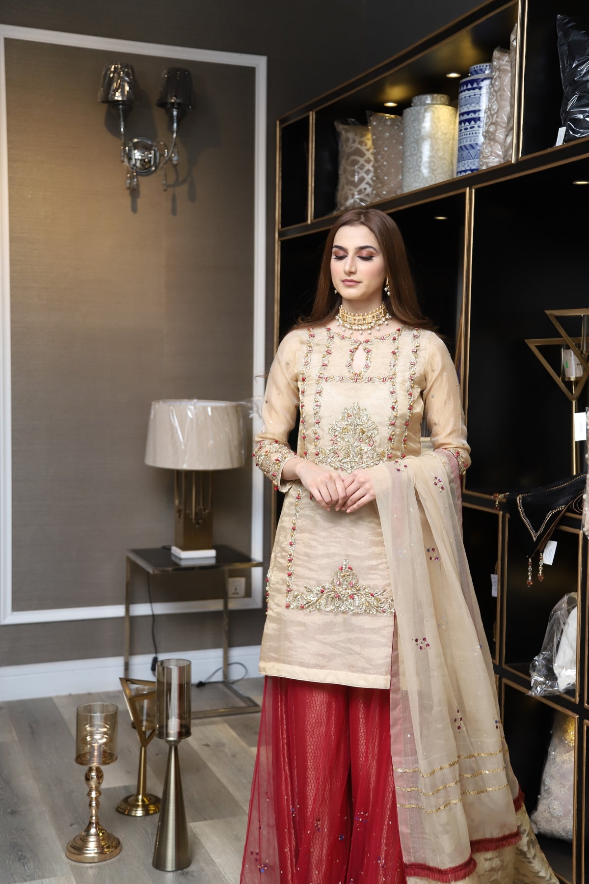 Blazing Gold is the perfect fusion of subtle gold and fiery maroon. The shirt is richly adorned with detailed handwork in gold, accented with hints of red, pearl white, and gold-lime hues. Paired with a graceful organza sharara and a net dupatta, this ensemble captures a dynamic yet modern charm, making it an ideal choice for formal occasions.
