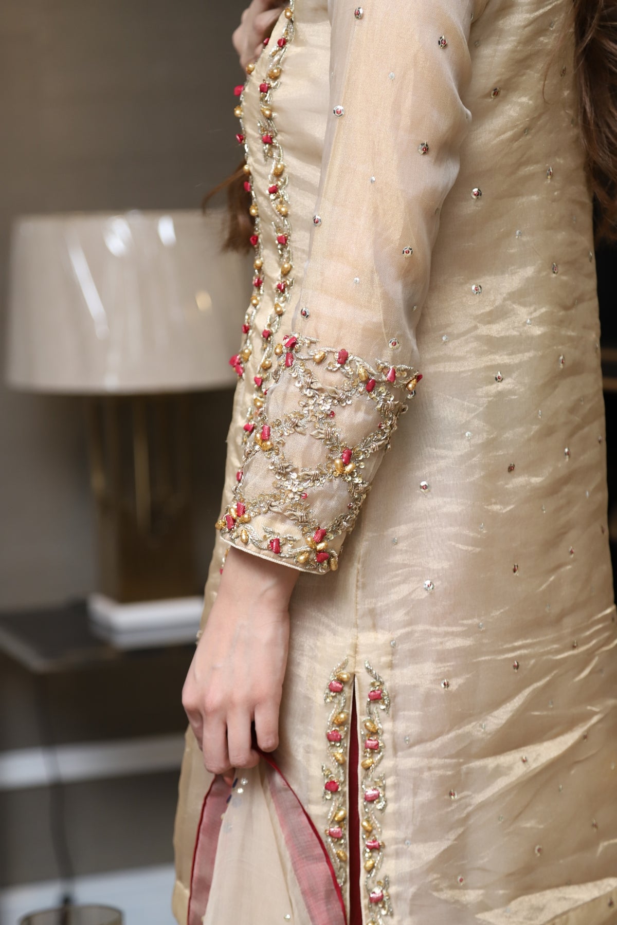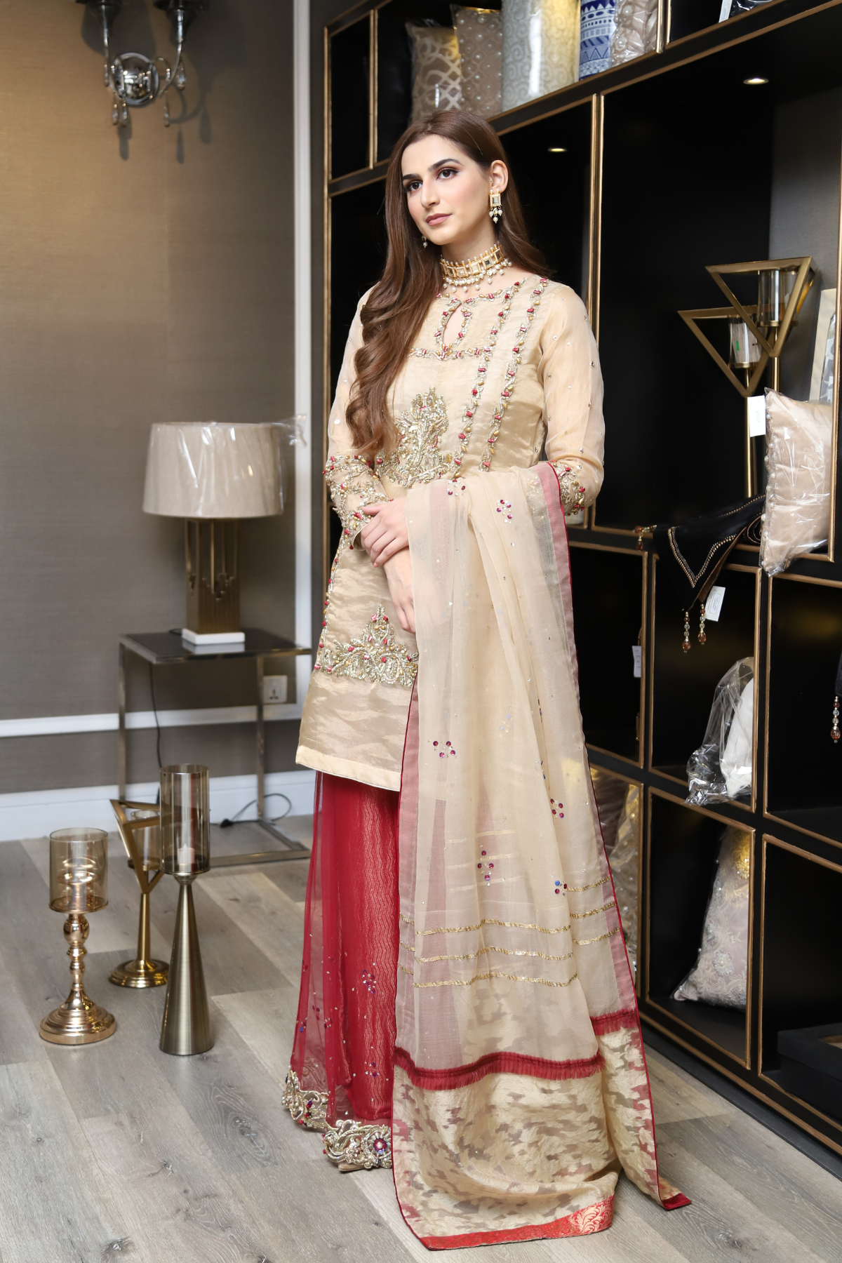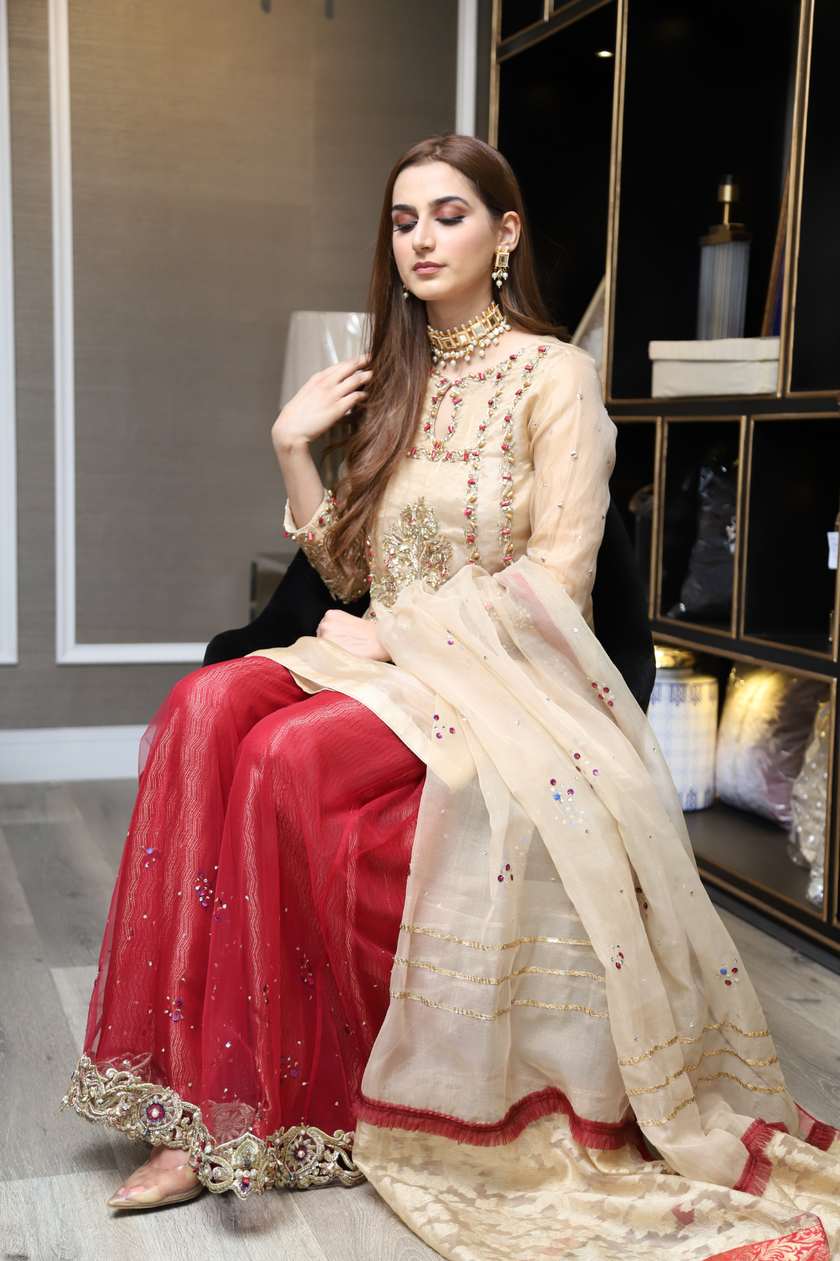 Blazing Gold is the perfect fusion of subtle gold and fiery maroon. The shirt is richly adorned with detailed handwork in gold, accented with hints of red, pearl white, and gold-lime hues. Paired with a graceful organza sharara and a net dupatta, this ensemble captures a dynamic yet modern charm, making it an ideal choice for formal occasions.