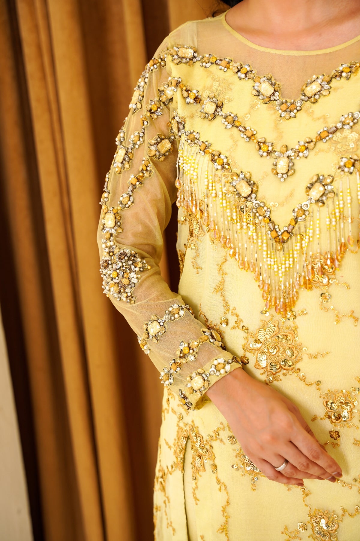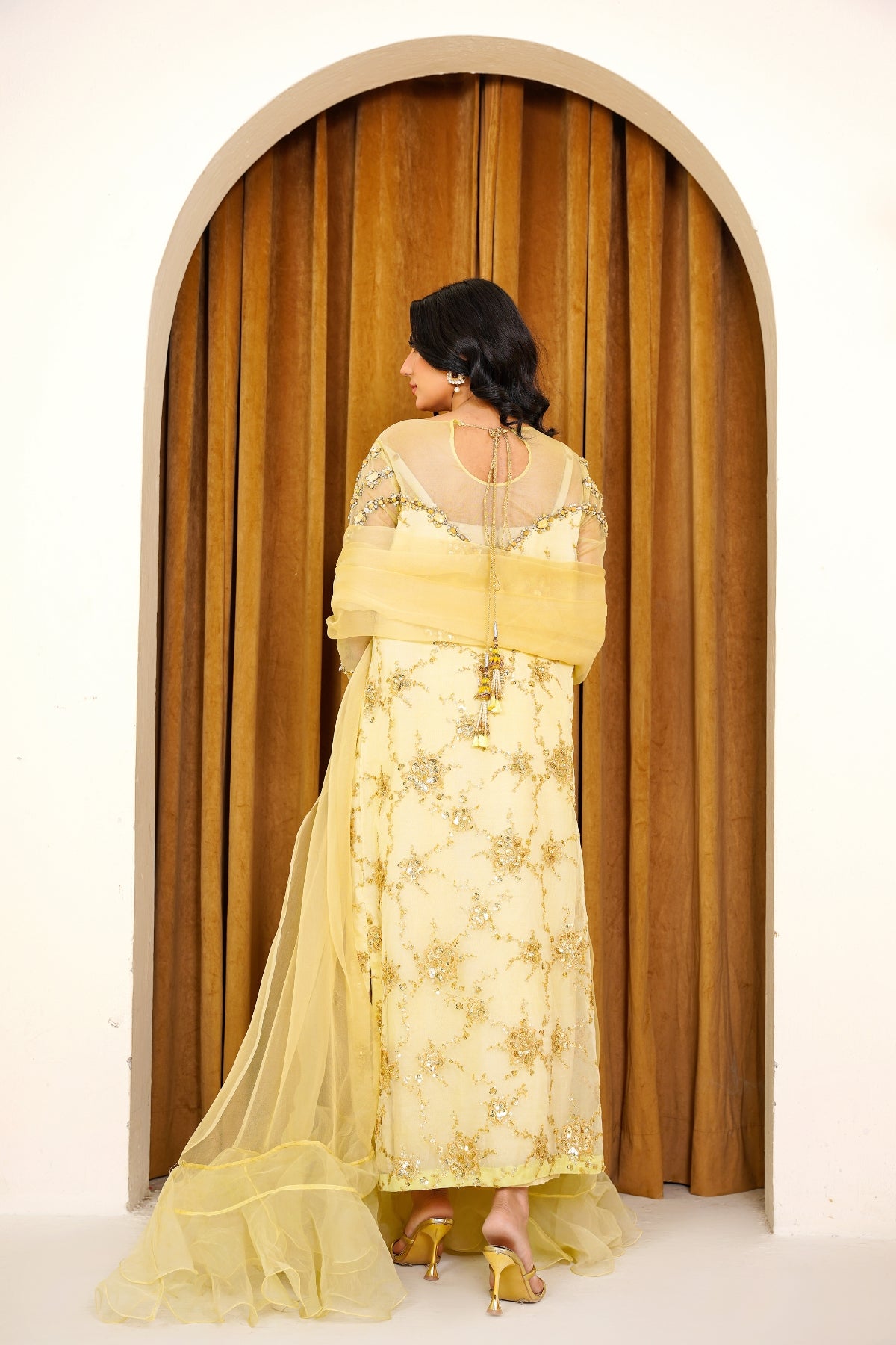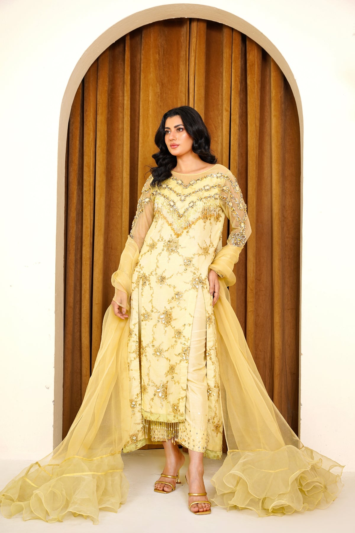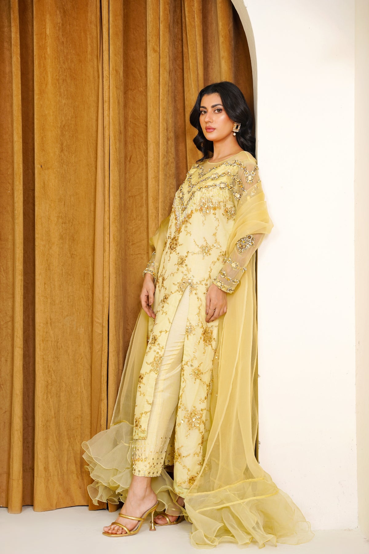 Make a radiant statement in this exquisite lemon-hued ensemble, crafted with elegance and sophistication. The organza shirt features delicate hand embellishments and intricate detailing, creating a perfect blend of luxury and grace. It is paired with a matching organza dupatta, finished with soft ruffled edges for a dreamy and feminine touch. The look is completed with a silk trouser, offering a refined finish and effortless comfort.